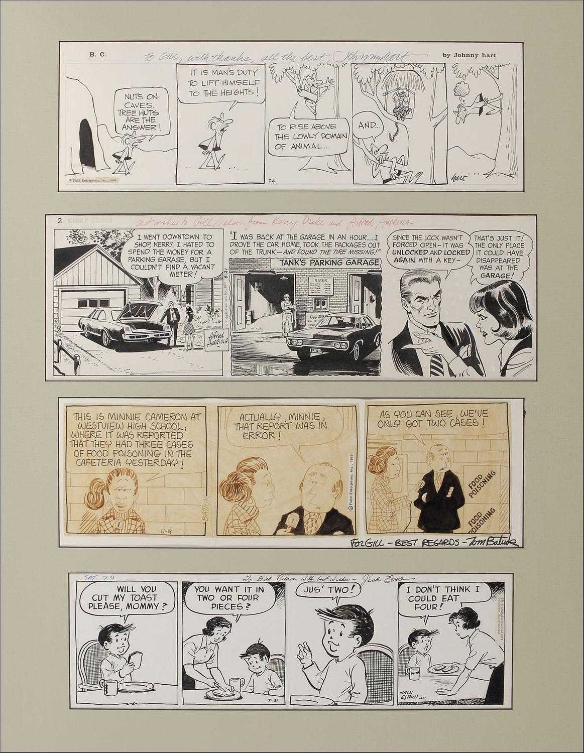Four original three-panel, four-panel, or five-panel daily comic strips from the 1960s and 1970s, each signed and inscribed by the respective artist. Signers are: Johnny Hart (B. C.), Alfred Andriola (Kerry Drake), Tom Batiuk (Funky Winkerbean), and Jack Elrod. All four comic strips have been matted together to an overall size of 23 x 29. In overall fine condition. Oversized.