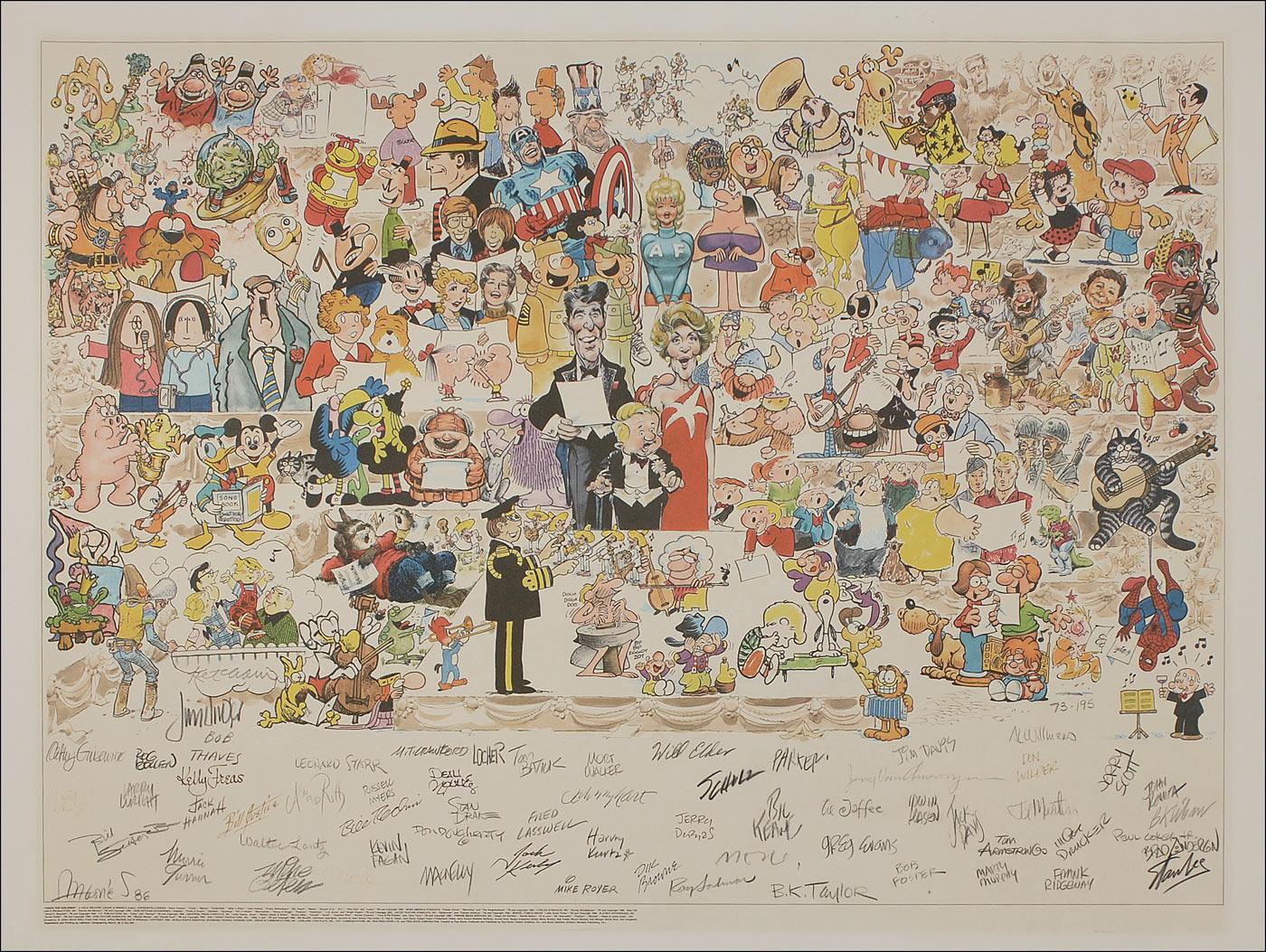 Limited edition color 35.5 x 26.5 lithograph issued in 1986 as a fundraiser for Voice for Children, #73/195, signed in artist’s pencil and ink by more than 60, including Cathy Guisewite, [Sergio] Aragonés, [Hank] Ketcham, Bob Thaves, Kelly Freas, Jack Hannah, Bill Justice, Walter Lantz, Arnold Roth, Leonard Starr, Russell Myers, Kevin Fagan, Stan Drake, [Jeff] MacNelly, Jack Kirby, Fred Lasswell, Tom Batiuk, Johnny Hart, Harvey Kurtzman, Mike Royer, Dik Browne, Bil Keane, [Charles] Schulz, B. K. Taylor, Greg Evans, Al Jaffee, Jim Davis, Bob Foster, Irwin Hasen, Jack Davis, Don Wilder, Joe Martin, Frank Ridgeway, Mort Drucker, Tom Armstrong, Marty Murphy, Jerry Scott, John Romita, B. Kliban, Paul Coker, Brad Anderson, Morrie Turner, Larry Wright, and Stan Lee. In very good to fine condition, with a touch of mild soiling, smudging or fading to a few signatures, and light toning from previous framing. This litho represents one of the largest assemblage of cartoon talent in the history of the industry.