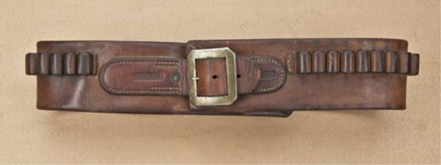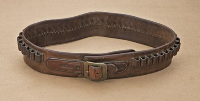 Cartridge belt/money belt marked “F. A. Meanea, Cheyenne, Wyo”. .45 caliber loops, belt measures approx. 3-1/4” in width. Shows silver-plated brass harness type buckle and is duel marked on front. The belt is in very good condition showing some slight fraying, normal aging, all original loops are intact and shows patina in the form of .45 caliber rifle cartridges which it carried. These Wyoming marked frontier leather items are collectible and desirable. Est: $2,000 - $4,000