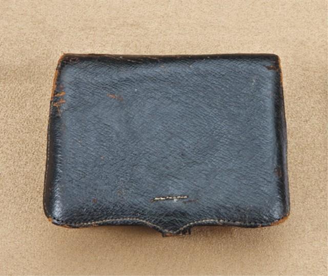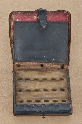 Cartridge box for .32 caliber rimfire shells, 18 rounds, military style, but commercially purchased, probably by an officer. Good condition. For use with Smith & Wesson #2 revolver. Marked G. Jassate, patented September 17th, 1861, which is almost illegible on the inner flap. A rare Civil War and Smith & Wesson accessory. Est: $300 - $900
