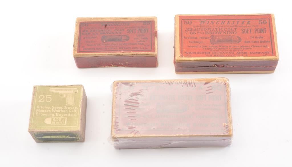 Cartridge collector’s lot of 4 boxes. 1. Colt .380 Auto pistol marked red label box by Winchester. Full and matching head stamps. Opened. Good minor tatters and loss. 2. 6.35 (.25 Auto) Germany Pre-War with photo of Ortgies patent marked Ortgies, Saur, Dreyse, Mauser, Walther, Colt, Browning, and Bayard 3. .32 automatic Colt (7.65 Browning) by Winchester. Good label. Empty box. Very good.4. .25 Automatic Colt by Winchester, red label, 12 rounds soft point. Matching. Deteriorating. Est.: $250-$500