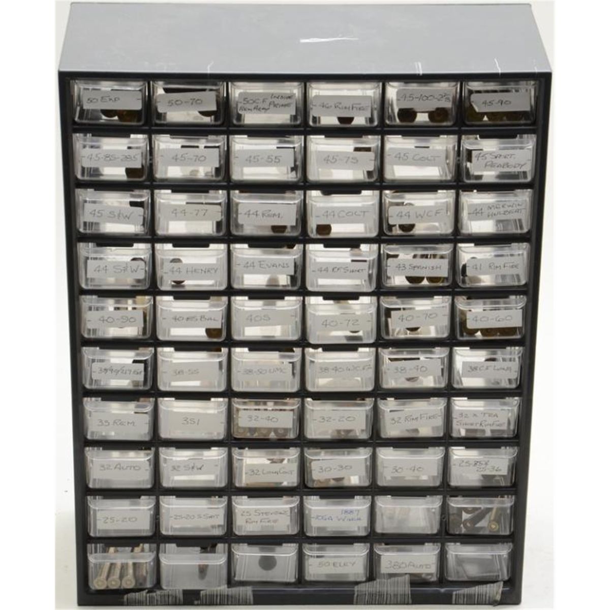 Cartridge collector’s lot of misc. early cartridges in a plastic and metal case approx. 18” x 14” with 60 drawers, some empty; examples of cartridges include .50 Express, .50-70, .45-90, .45-75, .45-70,.40-60, .40-90, etc.; many hard-to-find. Est.: $75-$150.