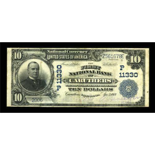 <B>Caruthers, CA</B></I> - $10 1902 Plain Back Fr. 632 <B>The First NB</B></I> Ch. # (P)11330<BR> An extremely rare Fresno County bank in large size which was missing from every significant California collection offered in the past three decades, not surprising in view of the fact that a meager $630 was outstanding from here in 1935. This piece, from the Kansas City collection, is new to the census and the nicest of any of the reported examples. <B>Fine-Very Fine.</B></I><BR><I>From The Kansas City Collection.</B></I><BR><BR><b>Shipping:</b> Coins & Currency (<a target="_blank" href="http://www.heritageauctions.com/common/shipping.php">view shipping information</a>)