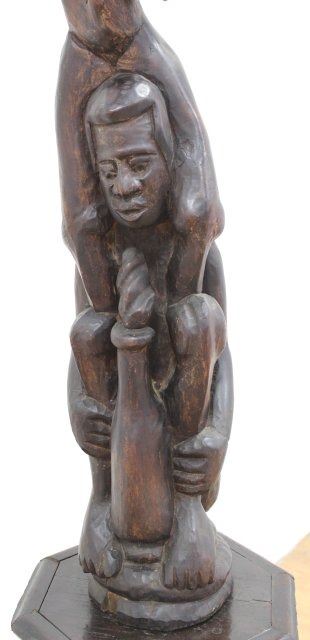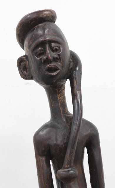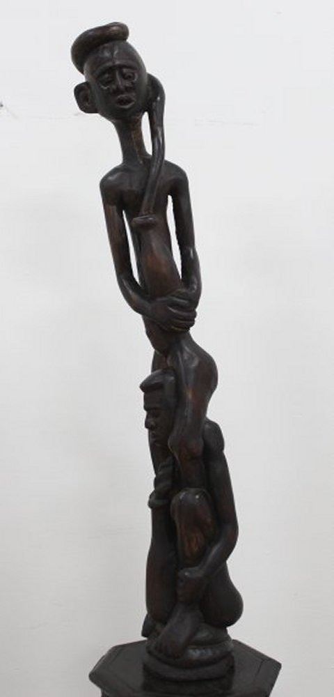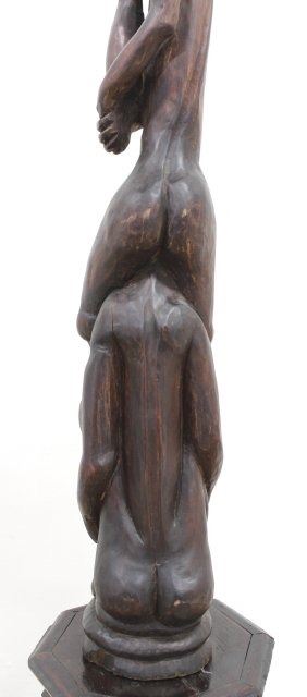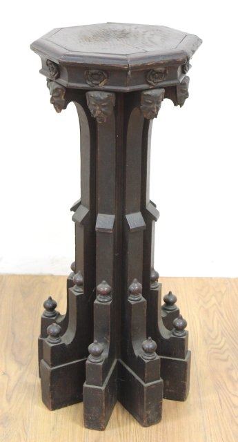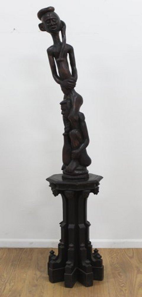 Mounted on gothic carved wood figural pedestal. Sculpture approx. 50" H. Pedestal approx. 32" H. Losses on pedestal.