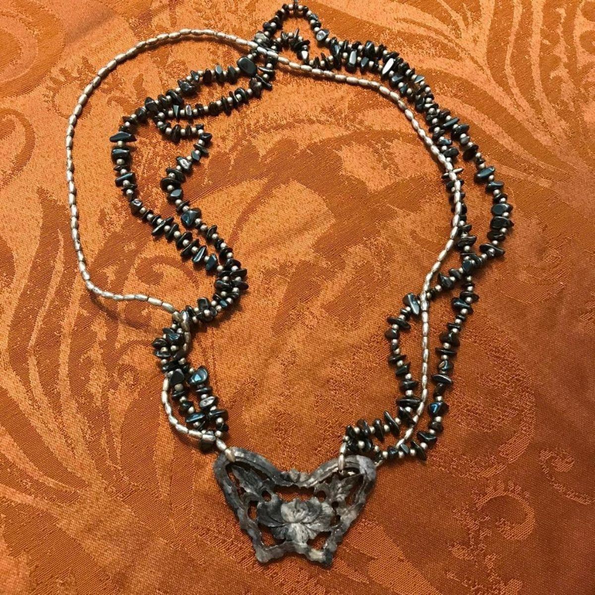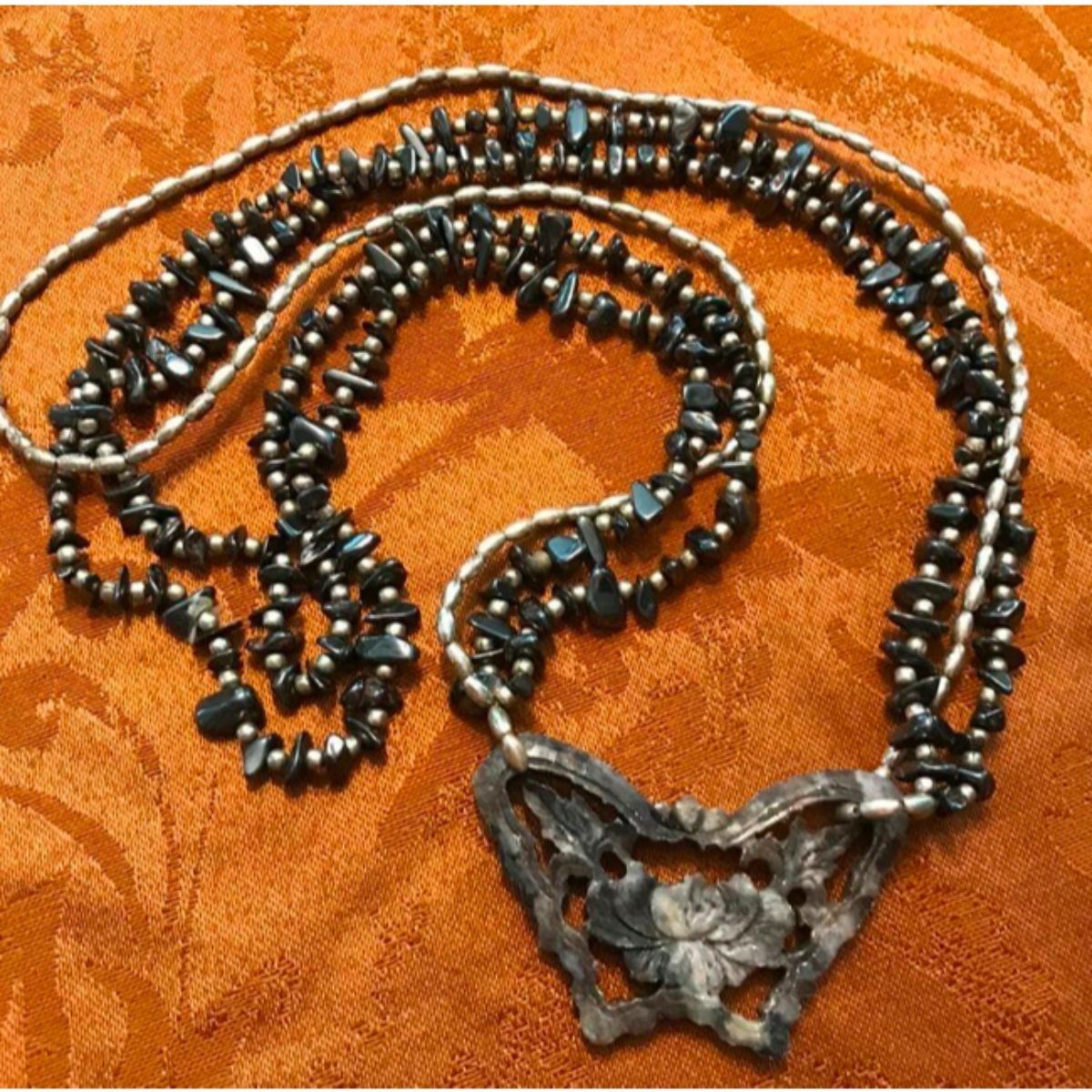 Carved gray pierced agate stone, with lotus center carving, butterfly pendant, with hematite chips & silver beads, multi-strand 24" necklace.