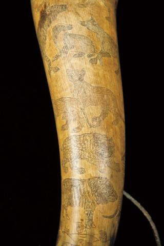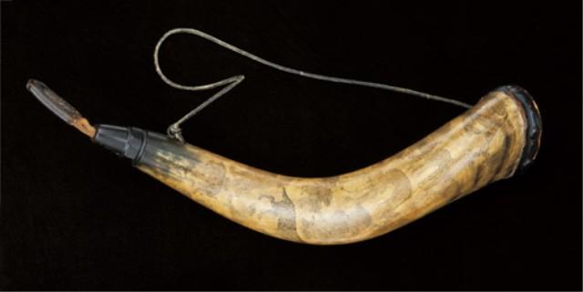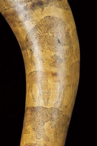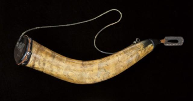 Carved American powderhorn circa mid 19th century  measuring approx. 16-1/4” from tip to plug.  Leather cover over wood plus in base, with large  enameled iron tacks and genuine to the period  leather strap affixed by small eyelet type hangars  with leather plug in spout. The horn is well  carved with figures of animals, particularly  several large American buffalo, antelope, deer,  bear, wolves, mountain lions, bobcats, armadillo,  javelina, skunk, prairie dogs, snake, and other beasts, all nicely detailed in a whimsical manner.  There has been a small plaque removed from the  base and the outline shows in the leather. The  horn shows an attractive patina and is definitely  genuine to the period of about 1830-1870 in our opinion. Provenance: Chris Anderson, Ft. Carson  antiques, 1970’s. Est: $2,500- $5,000