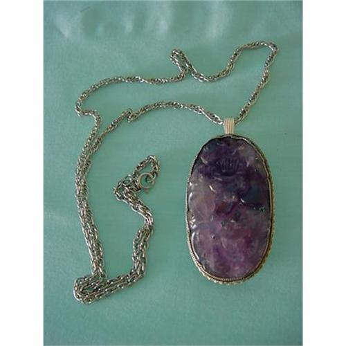 2 1/4 inch by 1 1/4 inch Pin Set in Silver Filigree Bezel ** Beautifully Carved Amethyst with Safety Clasp ** Comes with a 24 inch Silver Chain ** Can be worn on Chain or as a Pin ** Circa 1930s ** Excellent Condition
