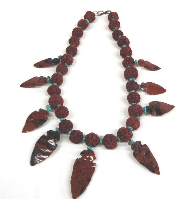 Carved arrowhead and bead necklace with turquoise spacer beads. Necklace measures 24.75'' end to end. Arrowheads measure 2.5'' L x 1'' W. Bead measure 75'' D.