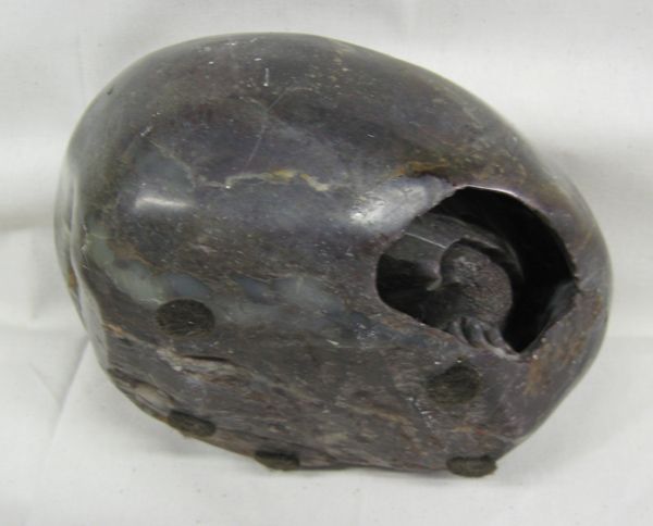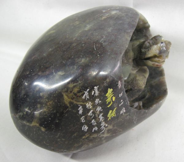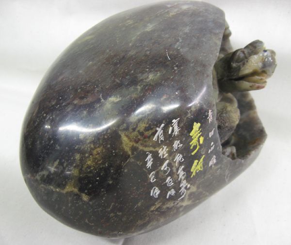 Carved Asian Egg With Turtle. Dark polished stone which appears to be a type of marble has a turtle emerging and also open in the back. It has asian characters written next to the opening. Amazing workmanship to have carved this out of one large rock. Measures 4.25'' long, 4.5'' wide.