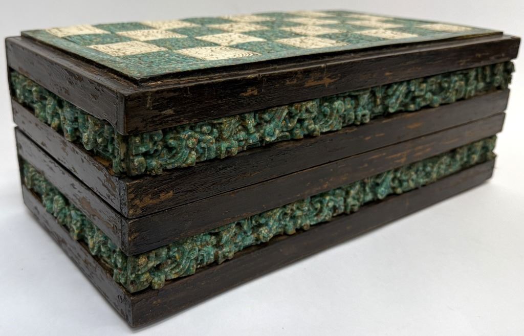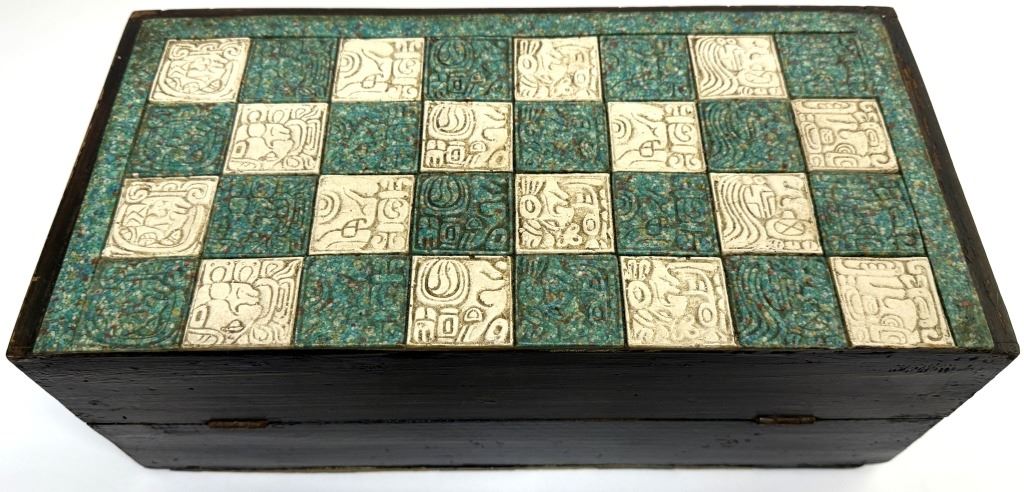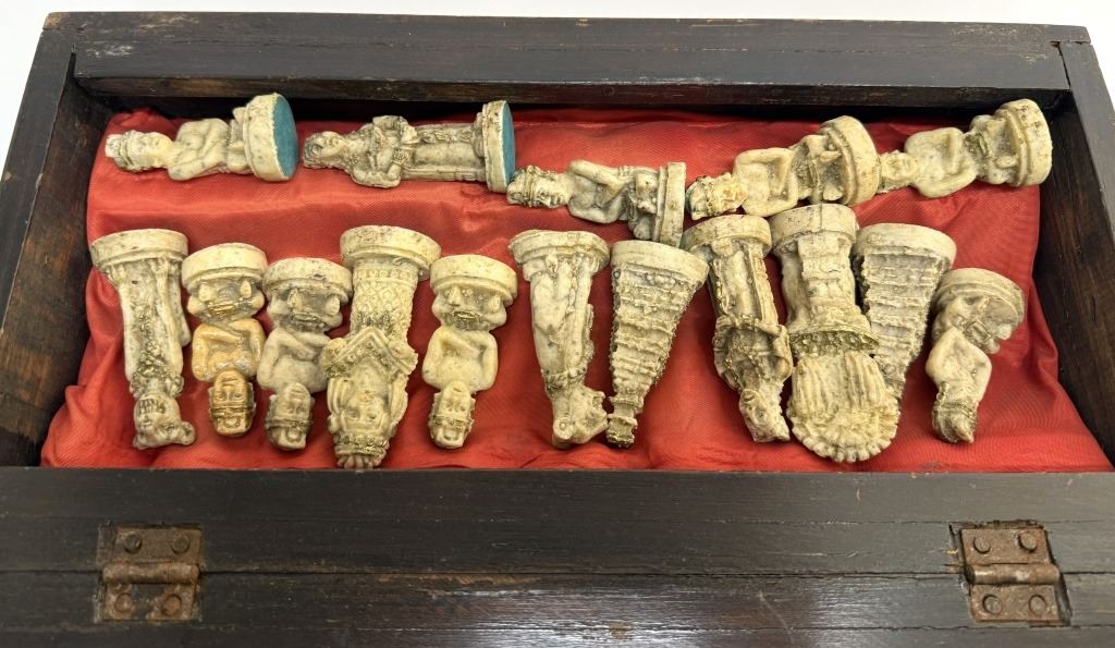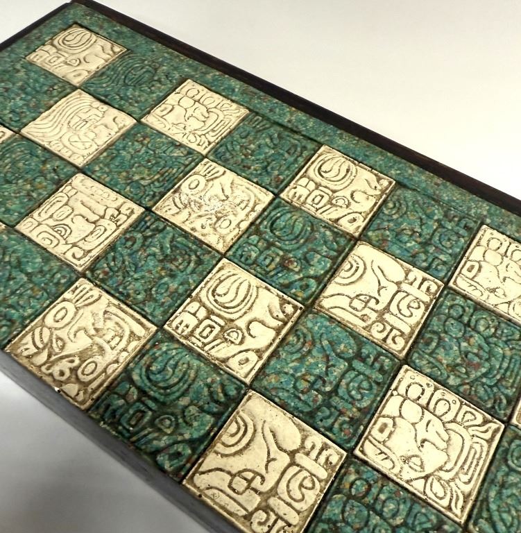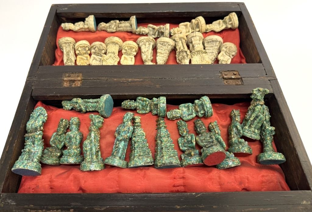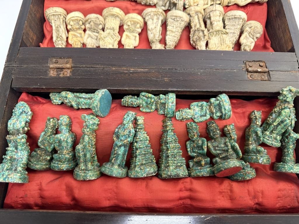 Item/Description: Vintage carved and painted souvenir chess set depicting Aztec and Mayan figurines. Complete set.
