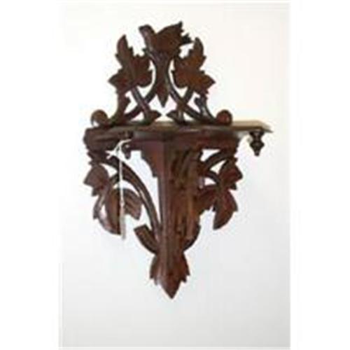 A nice small walnut wall shelf with carved leaves and a bird at the top.