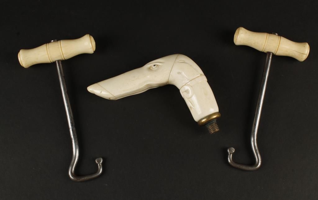 Cane handle is hound-like dog with bow around neck. 4-3/4" long x 3-3/4" tall x 1-1/4" wide. Has some small age cracks, otherwise good. The boot hooks are bone handle, Victorian era.