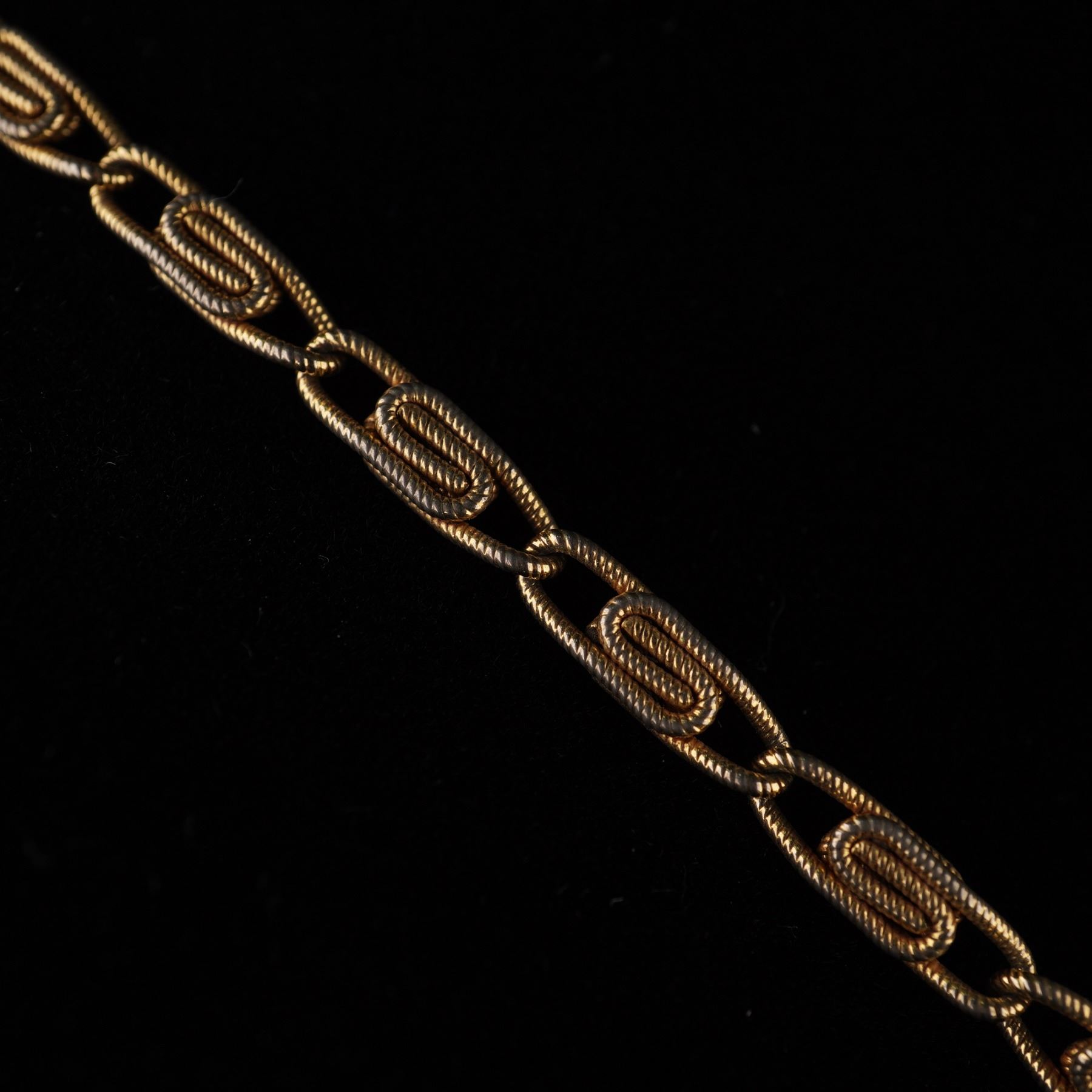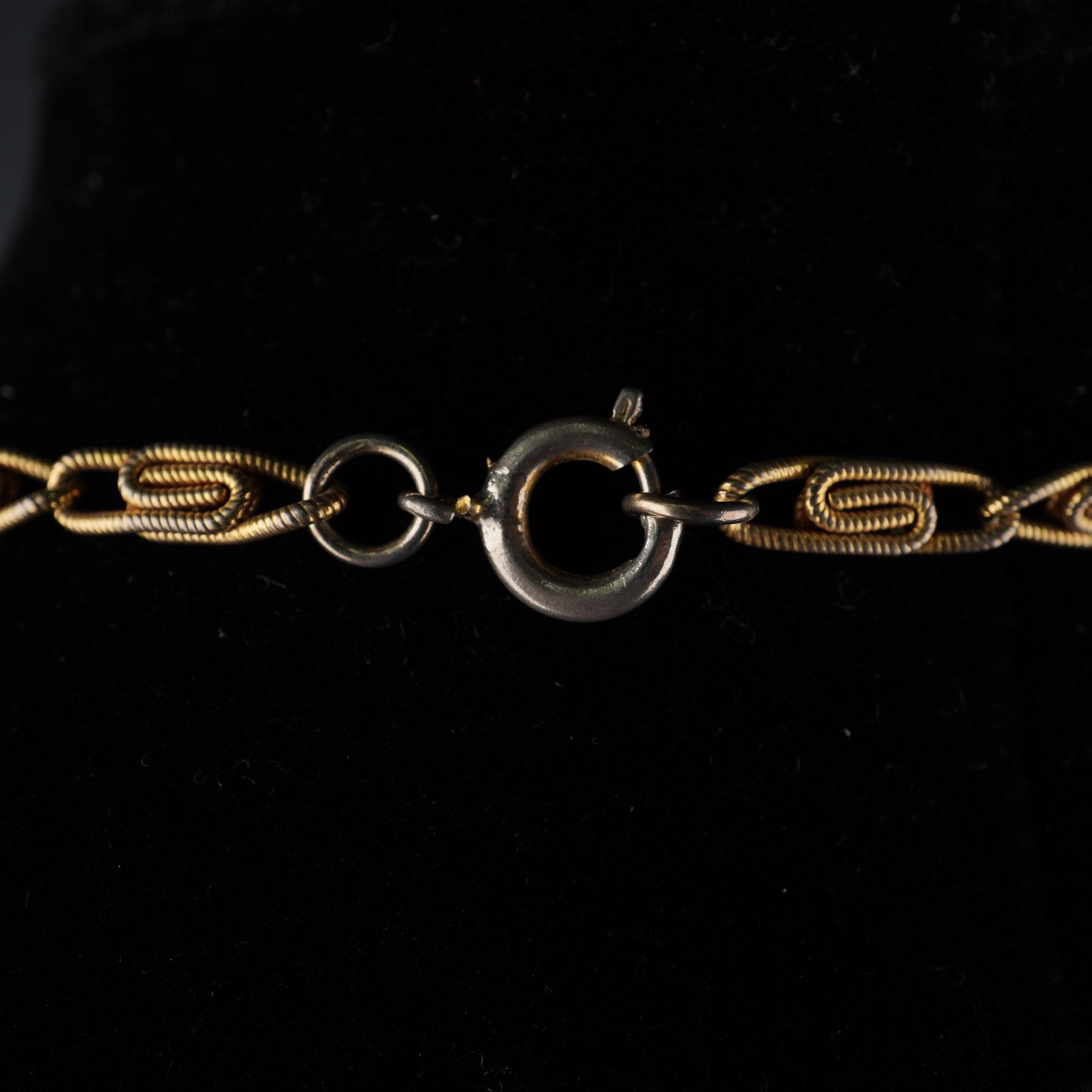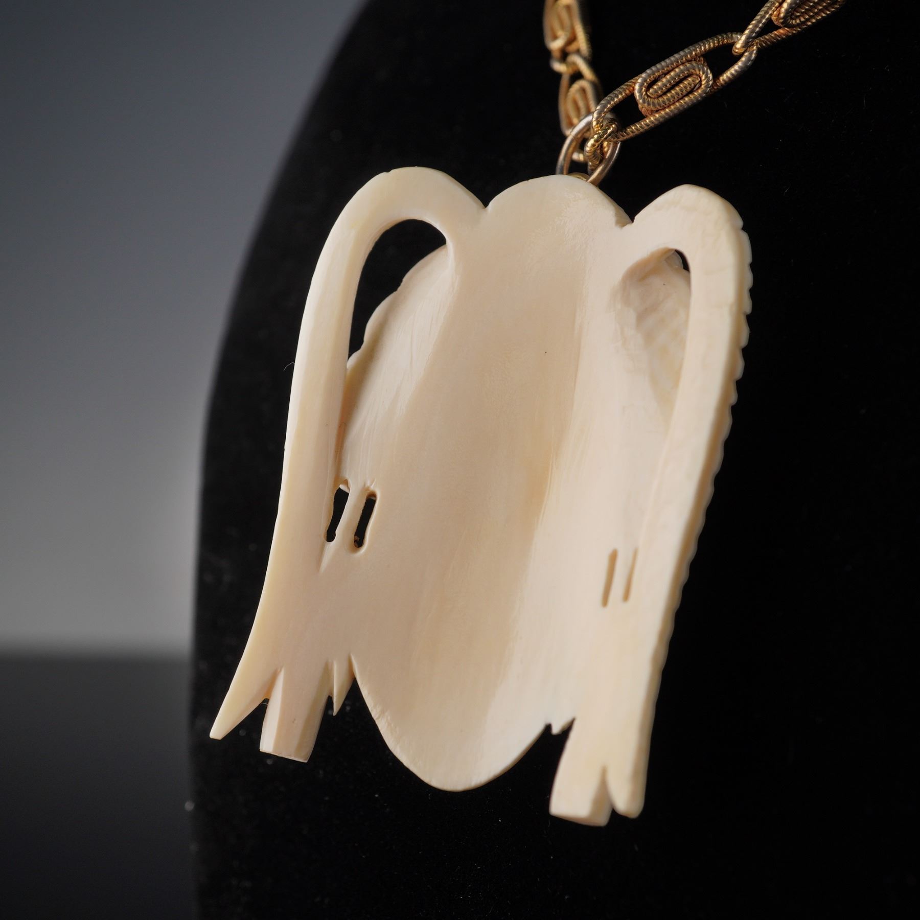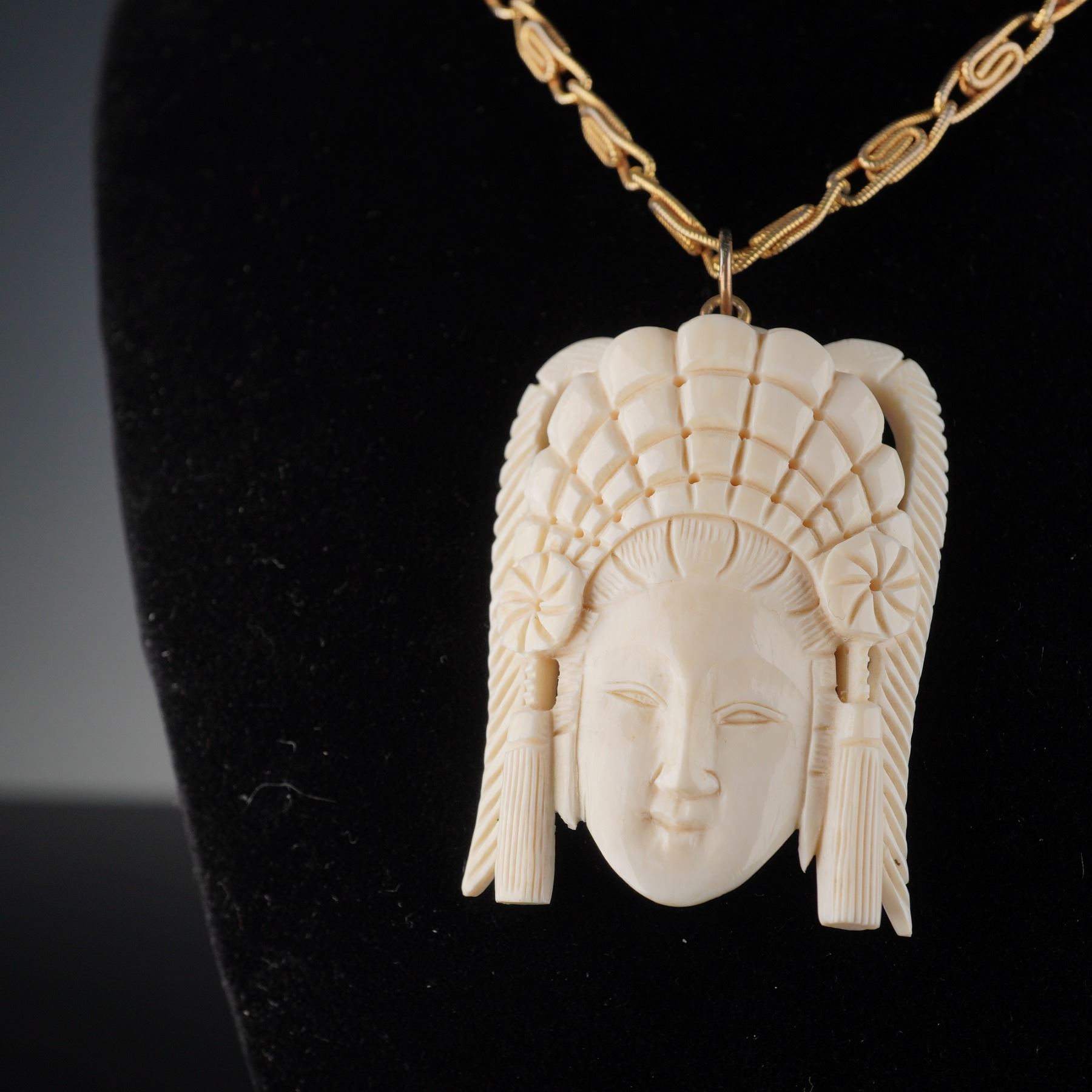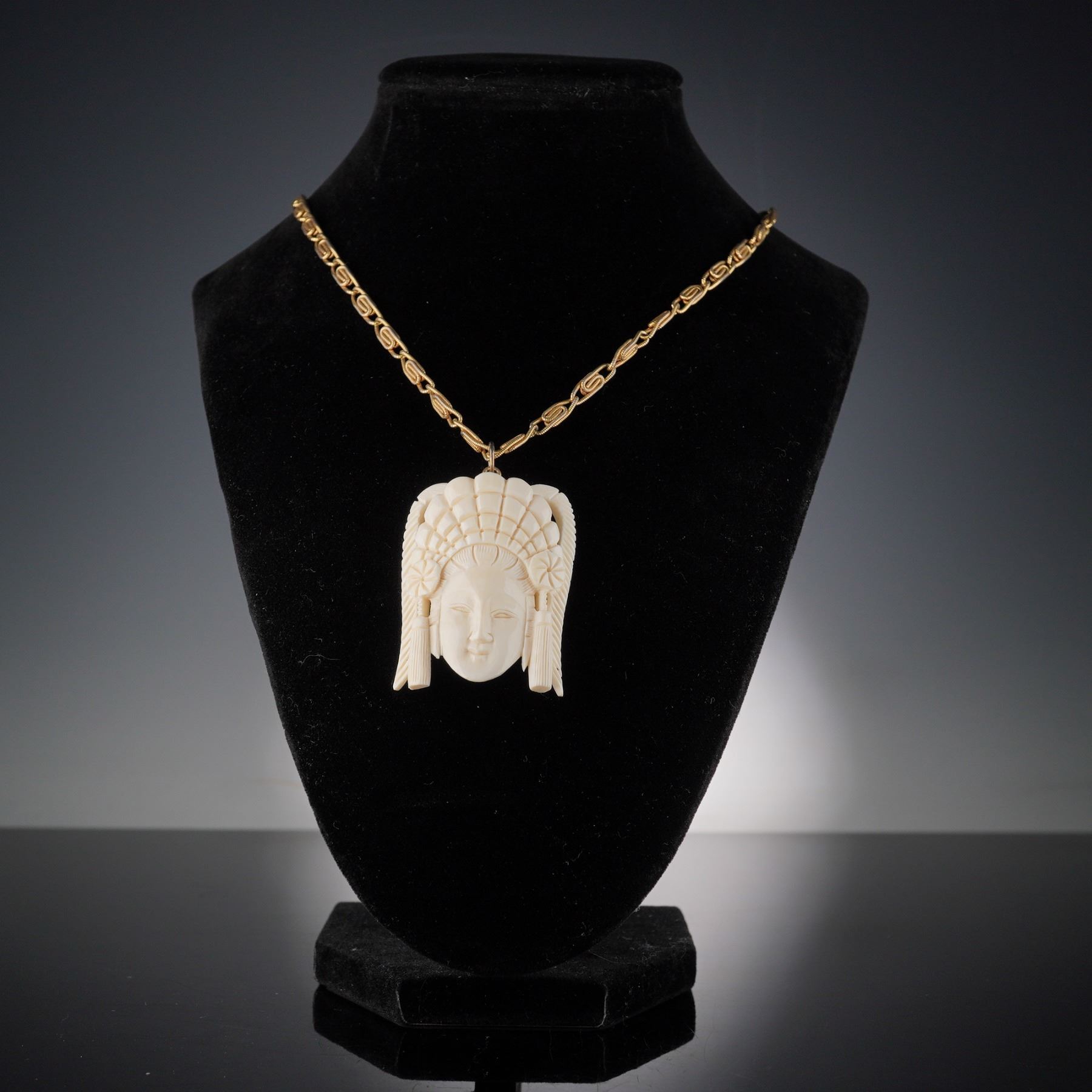 Pendant carved from bone depicting a stylized female face wearing an elaborate headdress with detailed geometric and floral motifs. The carving exhibits smooth surface work and pierced openings near the top for suspension. The pendant hangs from a gold-toned chain with textured oval links and spring clasp. A striking combination of hand-carved craftsmanship and ornate metalwork design. Total combined weight of pendant and chain: 27.4 g. Part of the collection of Charles H. McCollister, a world traveler whose circle included well-known figures.