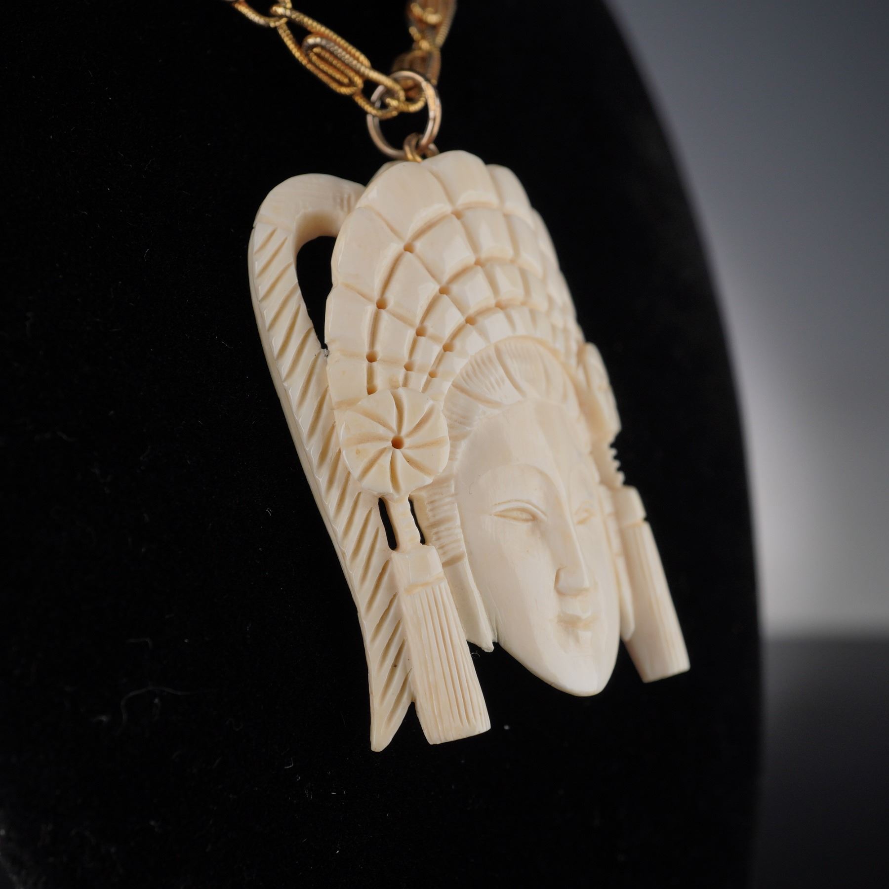 Carved Bone Female Mask Pendant on Gold Chain Necklace