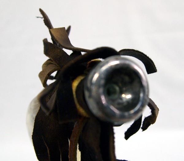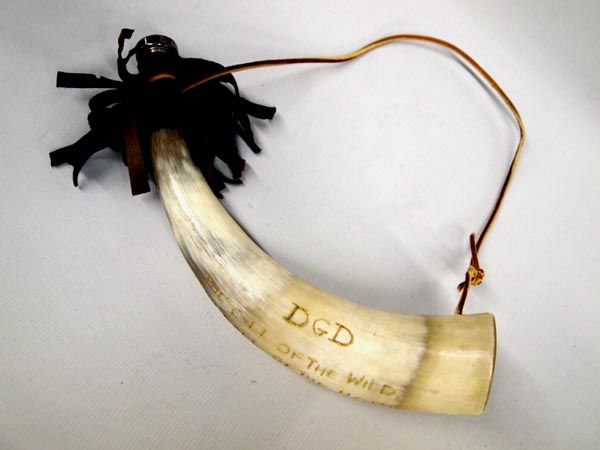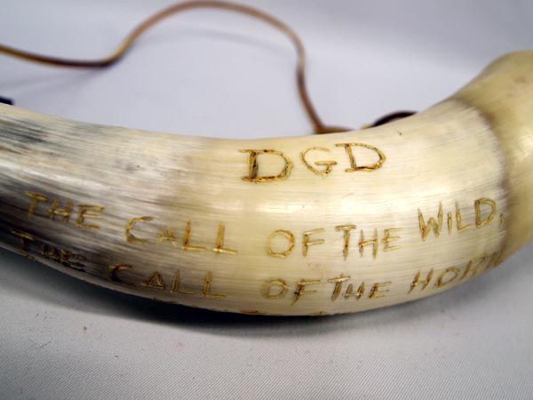 Carved Bone Horn. Intriquing carving on one side of this piece; ''DGD, The Call of the Wild, The call of the Horn, Turns Man to the Wilderness, Where First He Was Born. Measures approx. 10 1/2''L x 2''at widest part. Metal mouth piece, leather fringe decorations and leather thong strap.