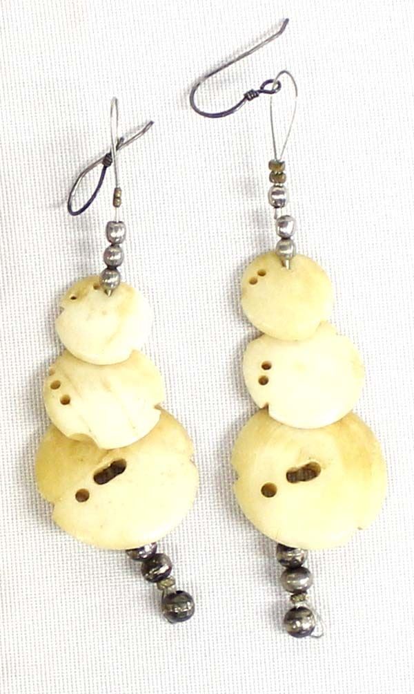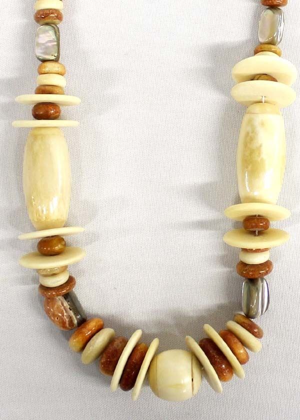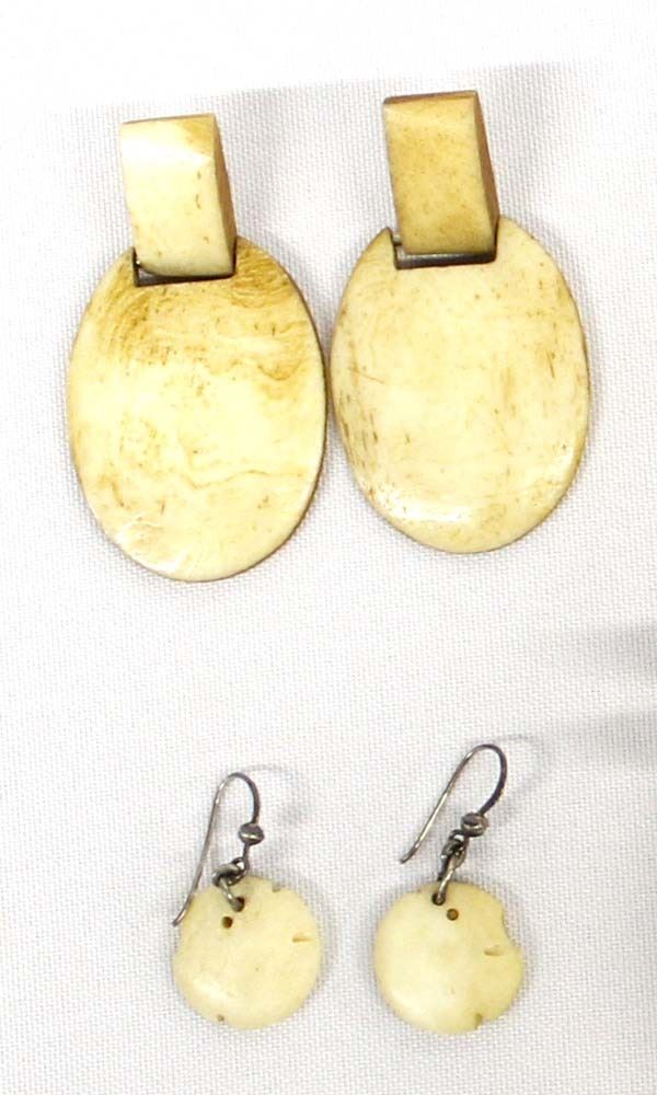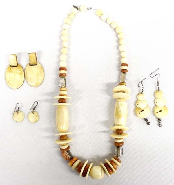 Beautiful Carved Bone Necklace and 2 Pairs of Earrings, includes: 1. Les Bernard necklace measuring 23''L end to end and is made of carved bone, apple coral, and abalone beads, longest bead measures 1 7/8''L x 7/8''D, has a very small silver bell and silver tag near clasp, Les Bernard produced produced a wide variety of jewelry from 1963 until 1996. 2. Carved Bone and Silver Bead Earrings measuring 3.75''L which includes the wire, largest bead measures 1''D 3. Carved Bone Post Earrings measure 2 3/8''L x 1.25''D