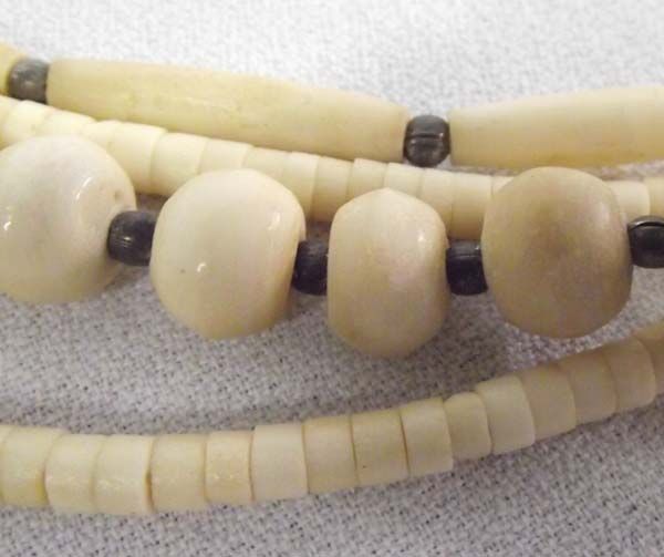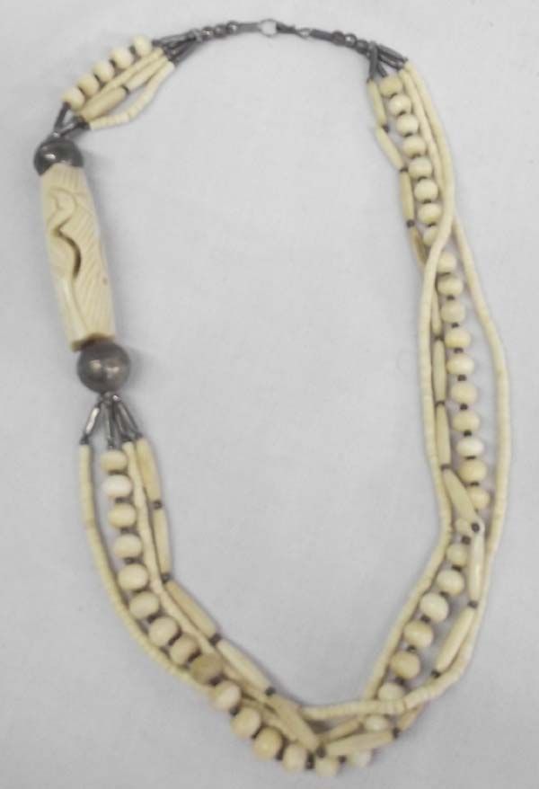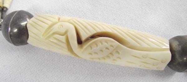 Carved Bone Sterling 4 Strand Necklace. Vintage 4 strands, two of Heishi bone and one with hare bone separated by silver balls and the last strand is ball bone beads separated by silver balls. One large carved bone bead has two bird figures carved in it. Each end of this bead has a large sterling silver hollow ball bead. The necklace measures 30''Lx3/4''W.
