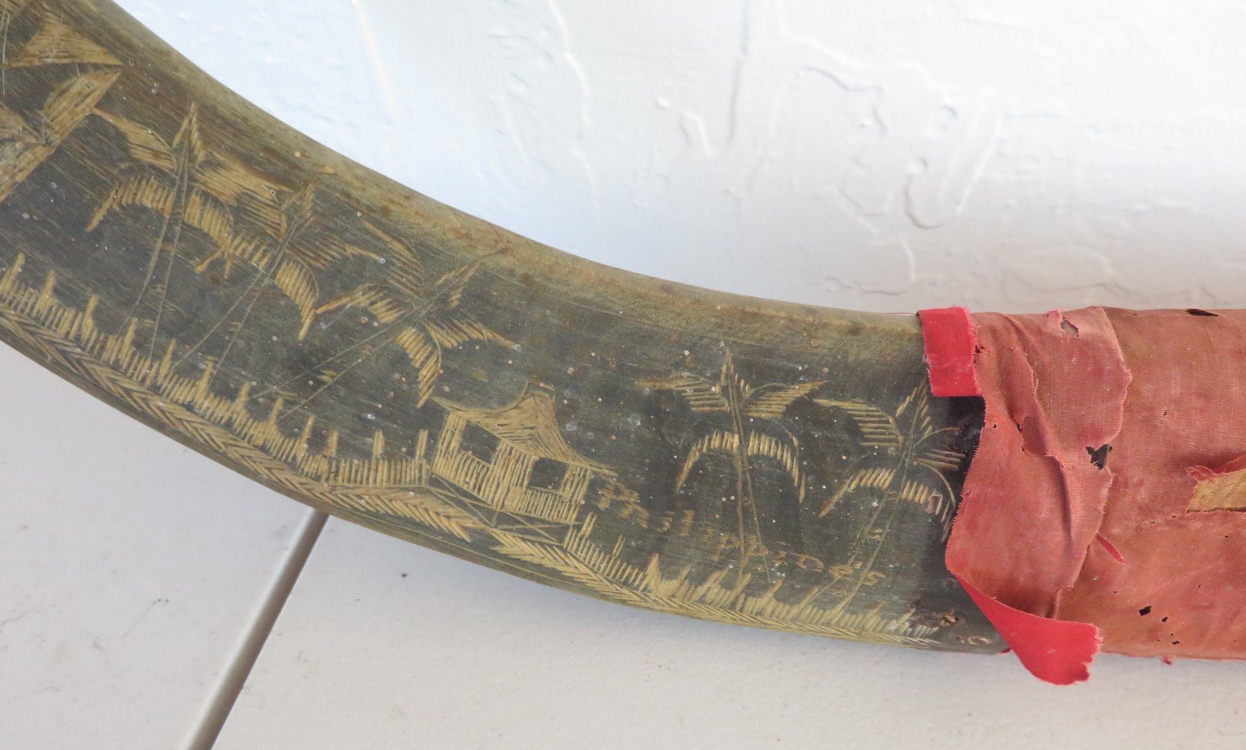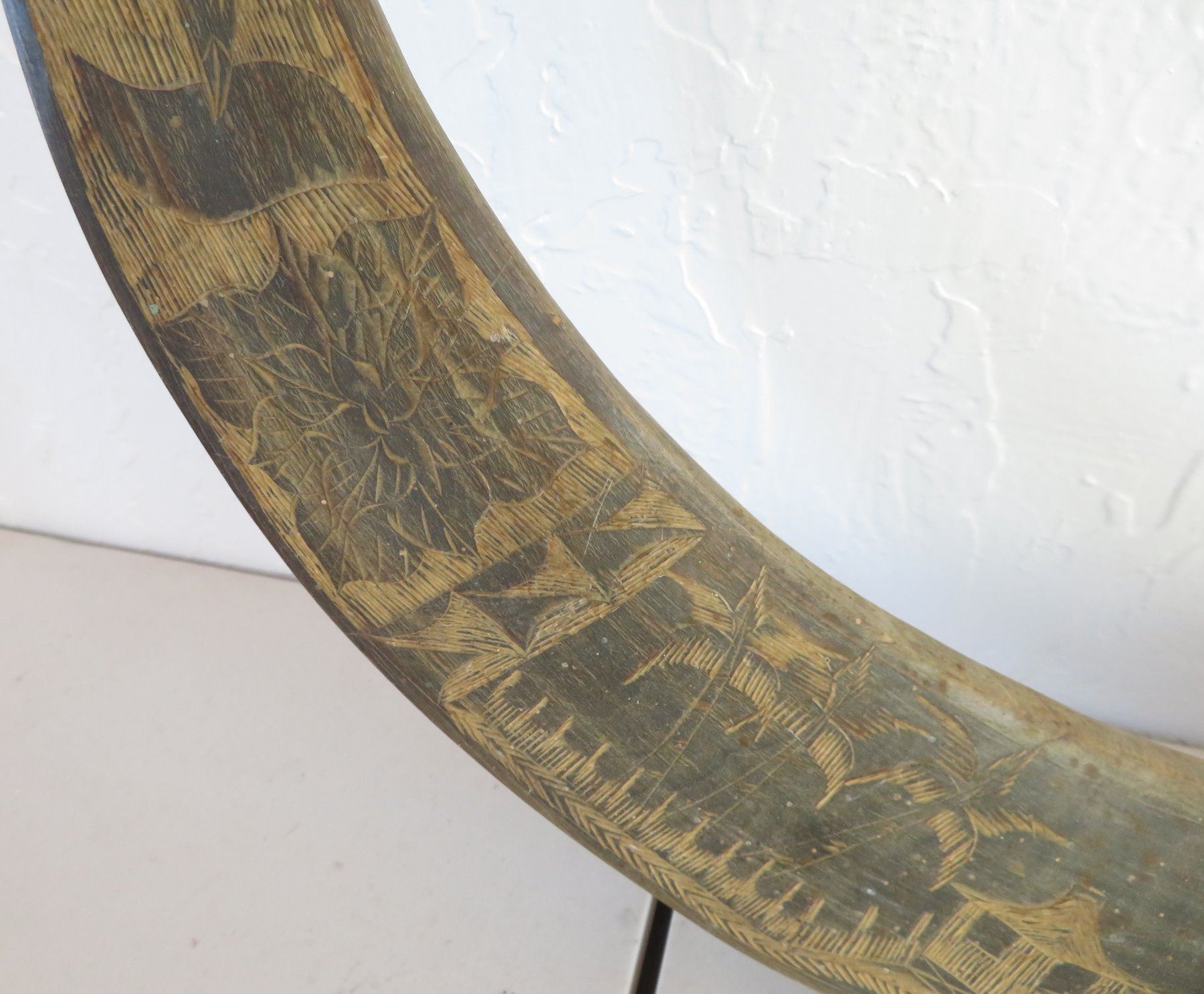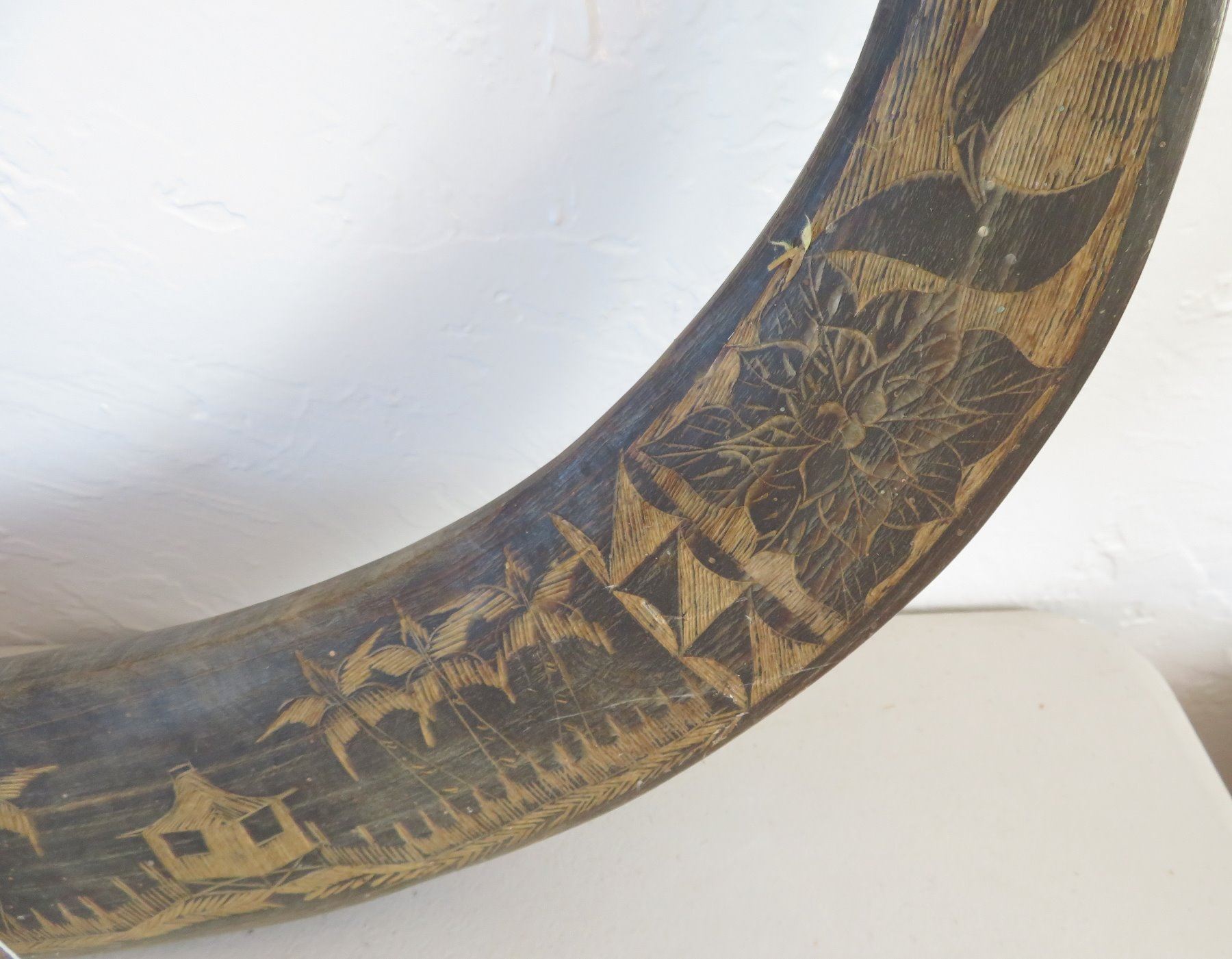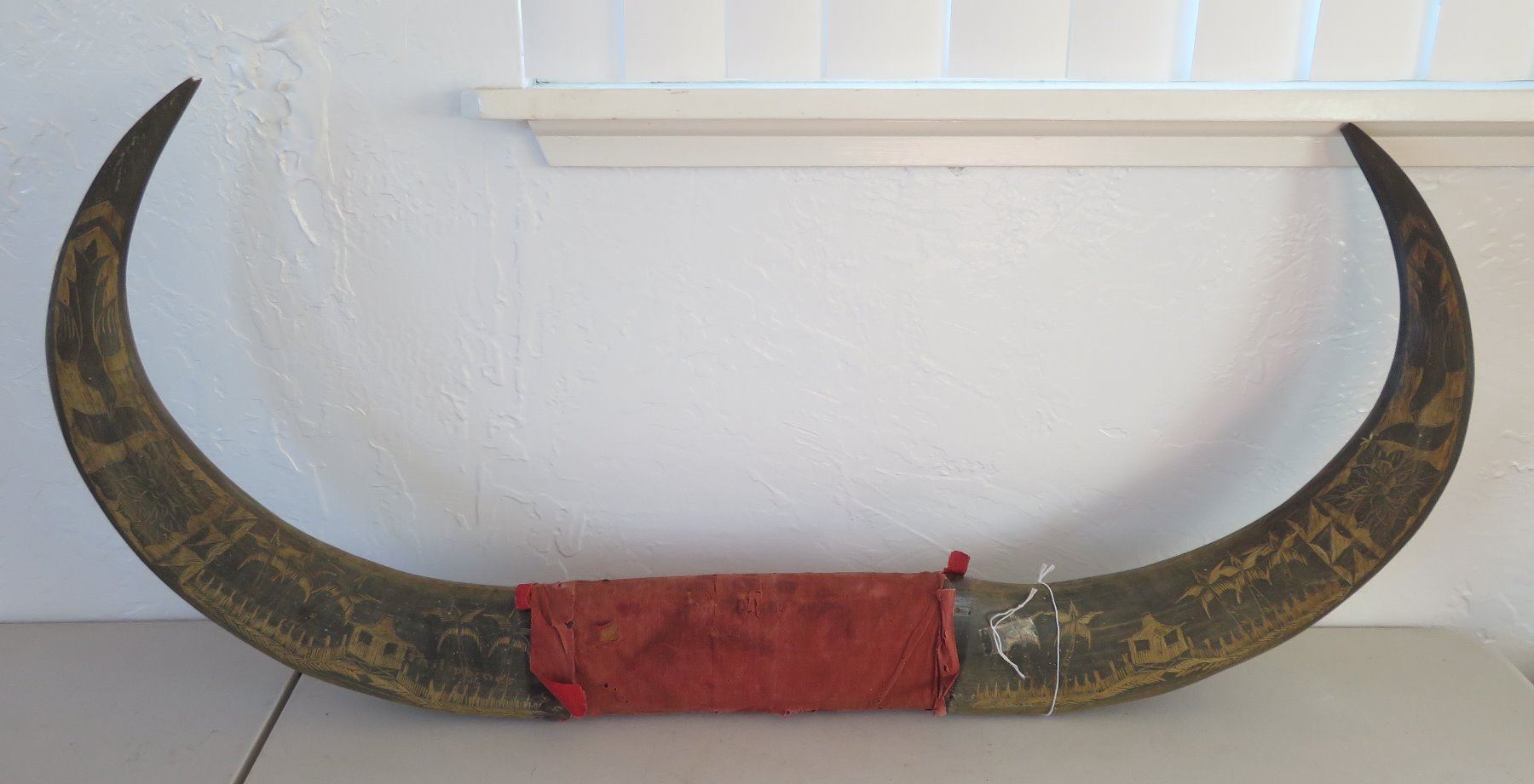 Carved Buffalo Horns, c. WWII period. Made of horn and wood, the item measures 16" x 36". Philippines. Condition: Wear, see images. Shipping: $85.00 USA estimate only, due to size and heavy weight, w/insurance and signature.