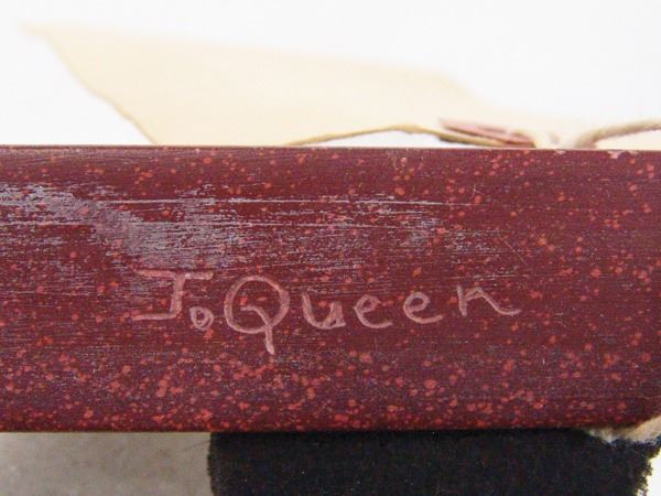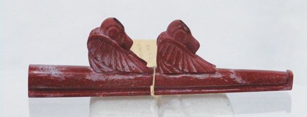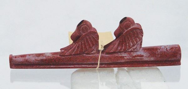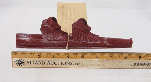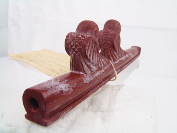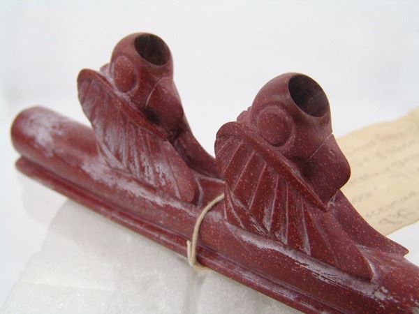 Wonderful, hand carved pipe stone (catlinite) pipe head with two eagle figures, and nice details. Very good condition, singed "J. Queen."Mid/Late 1900s8-3/4"