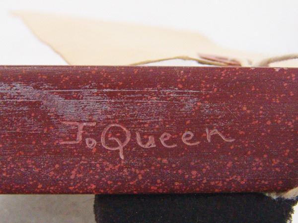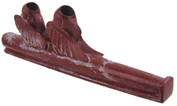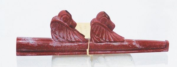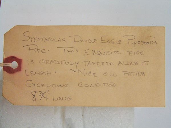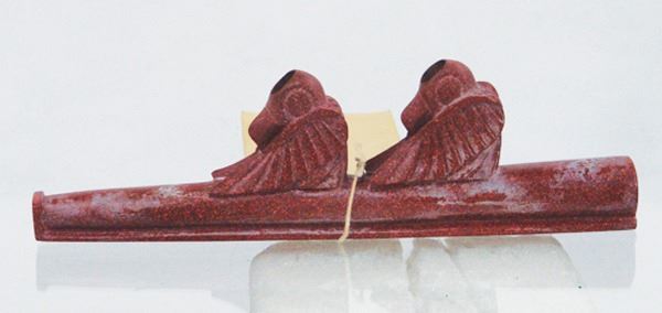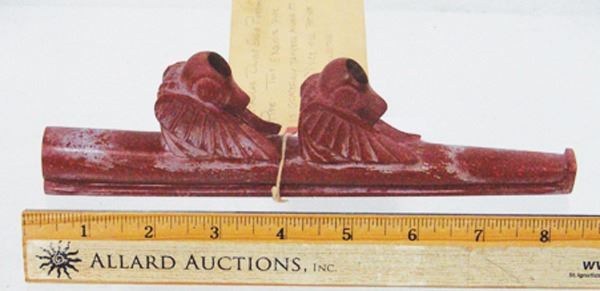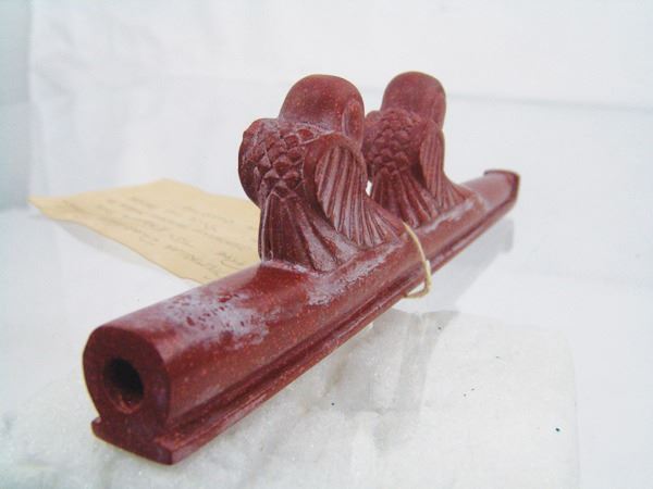 Mid/Late 1900s 8-3/4" Wonderful, hand carved red pipestone (Catlinite) pipe head with two eagle figures on top, and nice details. Very good condition, singed "J. Queen."