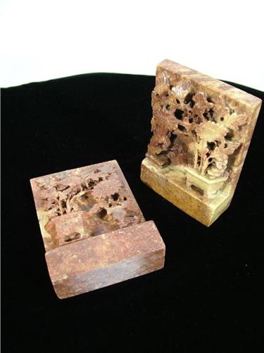 (China 20th Century) Pair of Agate book ends with flower carving, 8" by 4", each.