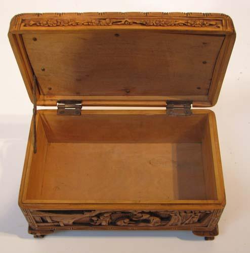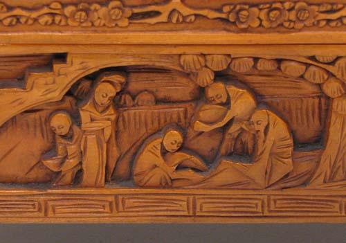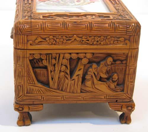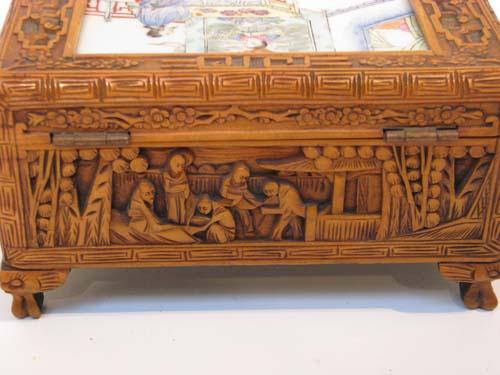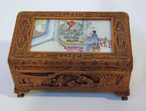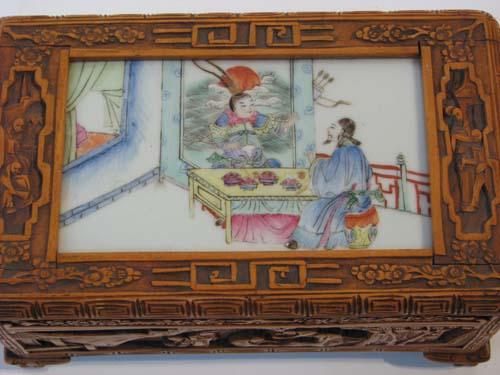 Title: Carved Chinese Box with Painted Ceramic Inset