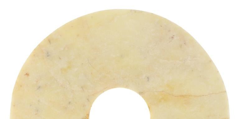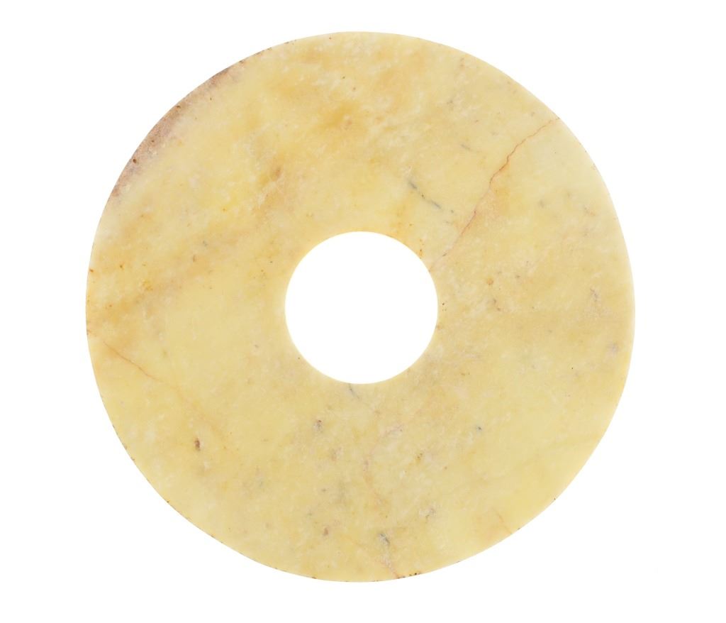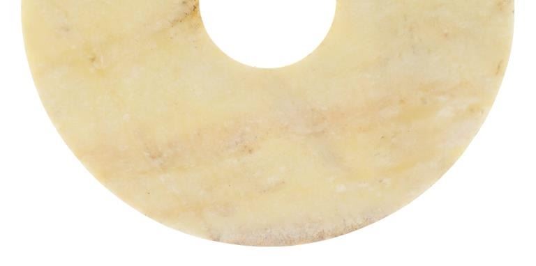 For your consideration is this carved Chinese jade (Bi) disc from the late Qing Dynasty (1644-1911). Chinese bi discs are jade discs that are flat and/or carved, with circular holes in the center. Some historians interpret the bi disc as a symbol of heaven; they are frequently found with heaven and earth-like images and were handled by shamans, religious leaders of Liangzhu society who taught fundamental cosmological principles to individuals of power and privilege. While their original purpose and significance are unknown, archaeologists have discovered them buried among the deceased upper class, believed to represent heaven and the sky and follow them to the afterlife. This jade disc shows a circular shape with a circular opening in the center. It shows lighter colors of olive green, gray, sage green, beige, brown and white throughout the piece and has a nice transparency when held up to a light source. The piece shows good condition overall with no wear or damage present. It measures a diameter of 9 3/8" and a thickness of 5/16". It weighs 2 pounds.