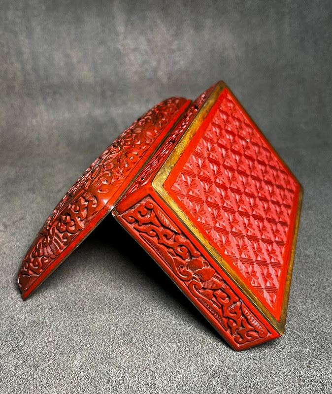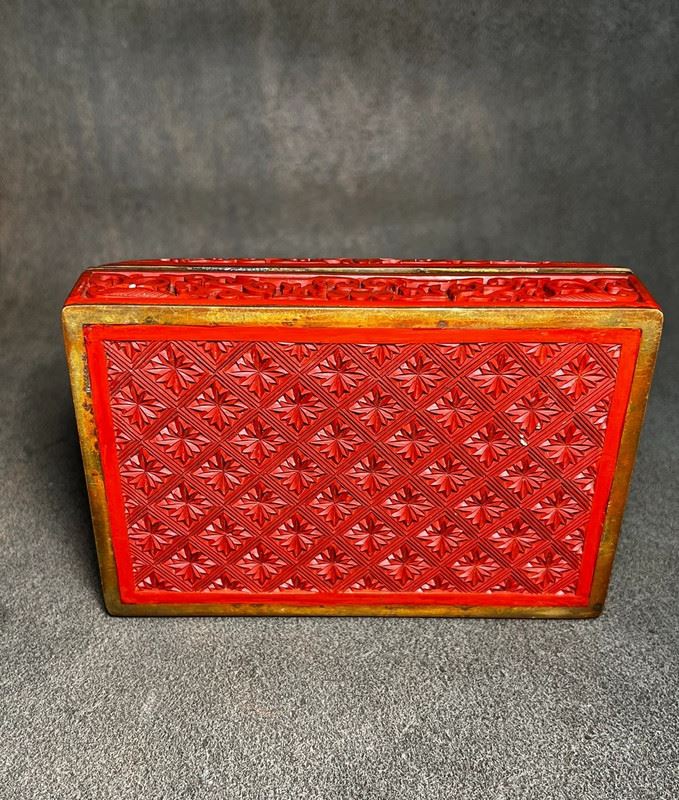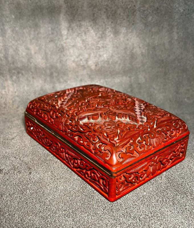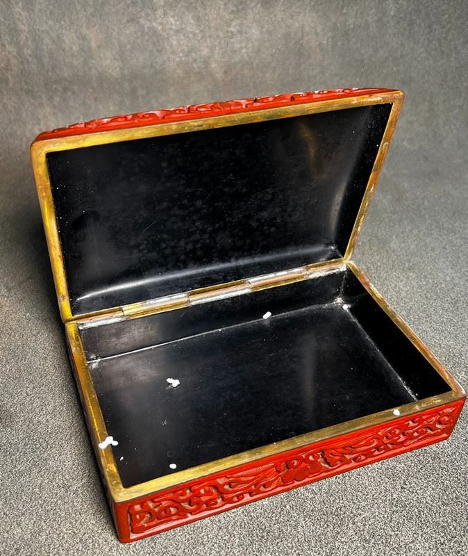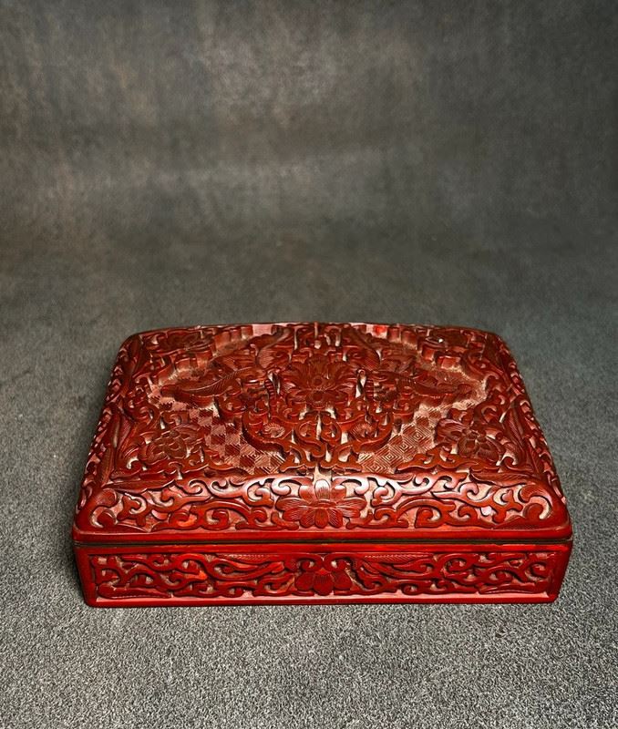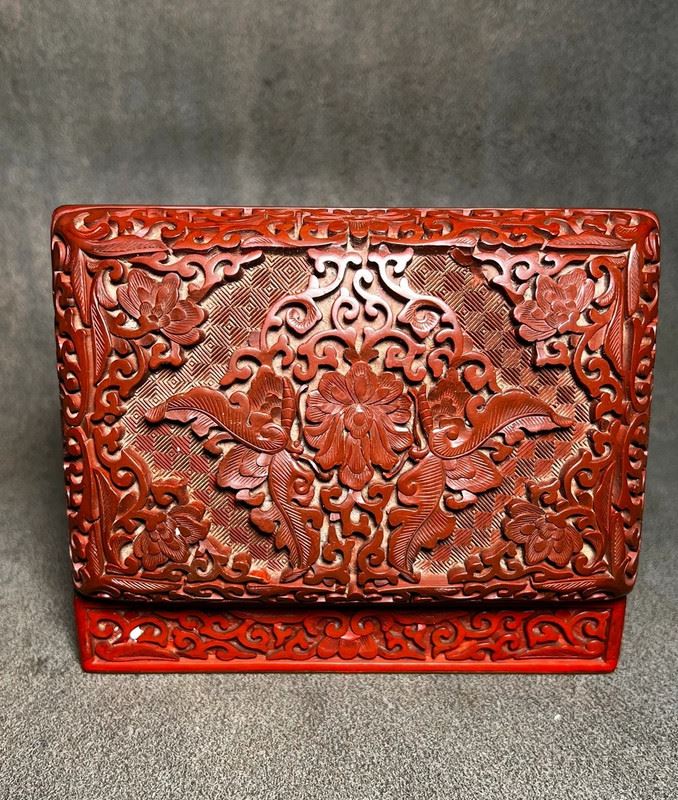This rectangular box is finished in red lacquer, intricately carved with floral and bird motifs in relief. The cover is richly decorated with blossoms and birds, framed by scrolling borders, showcasing the exquisite craftsmanship of carved cinnabar lacquer. The layers of carving create a vivid three-dimensional effect, while the black lacquer interior adds contrast and elegance. A refined piece that combines practical function with high artistic value.