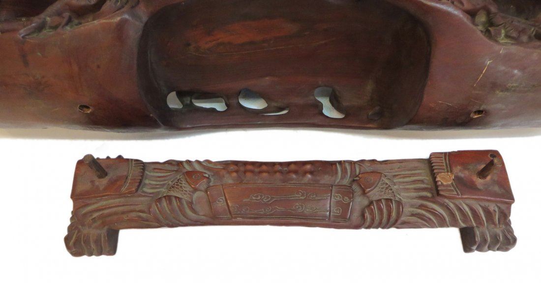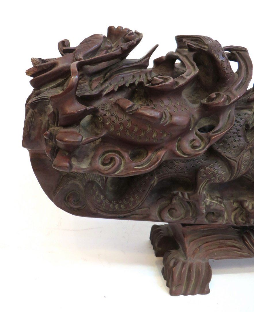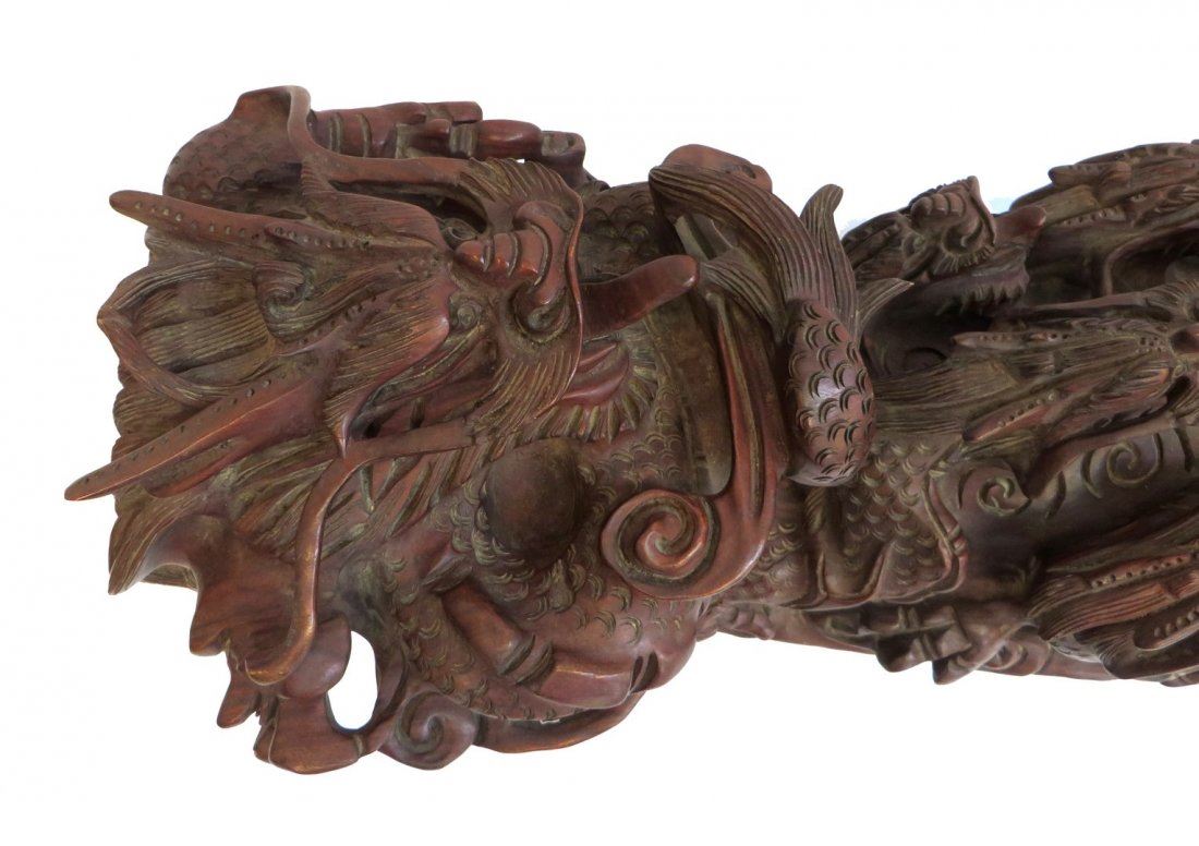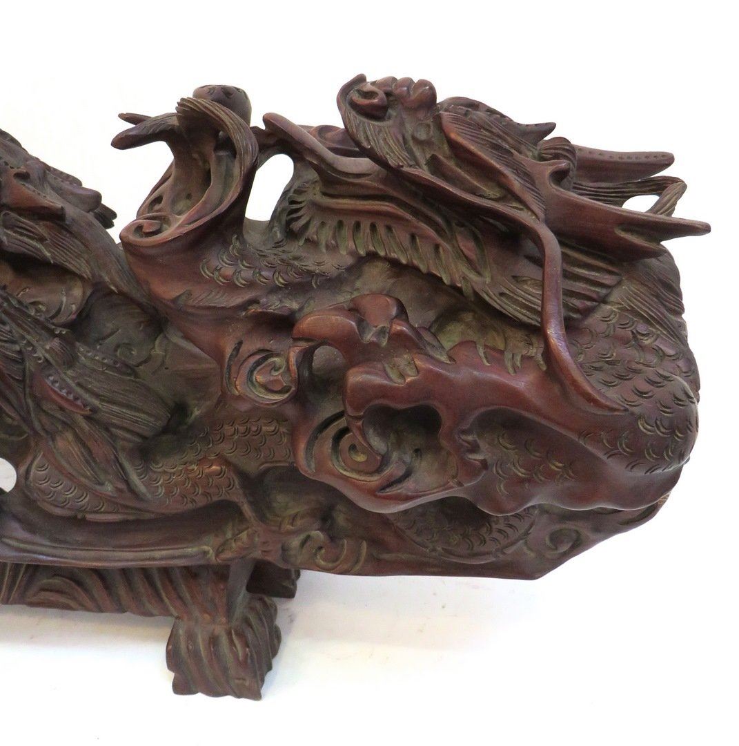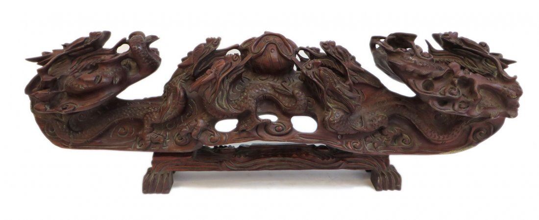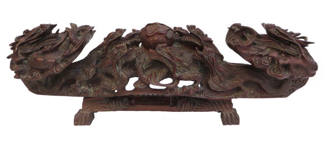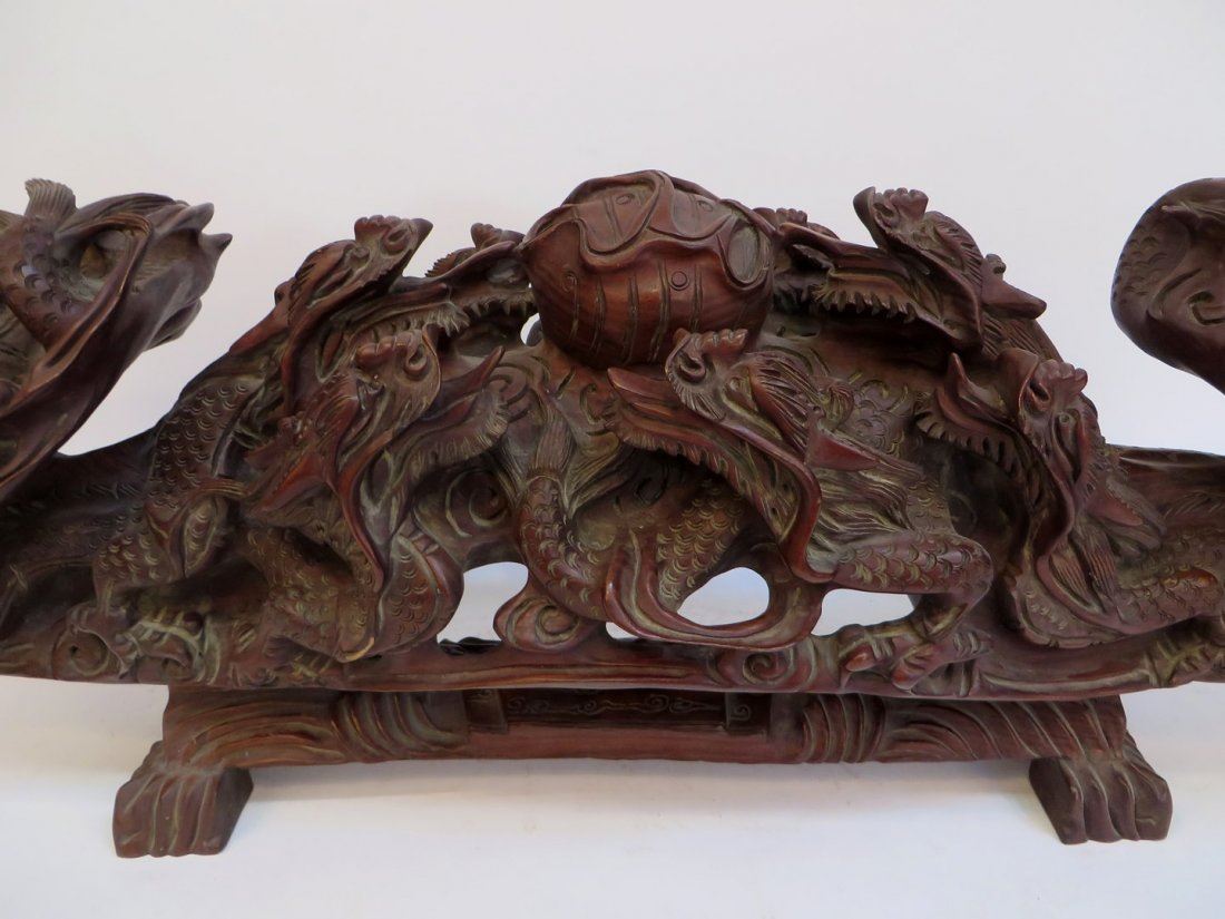 Carved from massive, heavy single wood piece (with a separate fitted base) in Ruyi like form with nine dragons approaching a central flaming pearl. NO RESERVE! ! Most items in this sale have no reserve Only 20 lots in this sale have reserves, marked with "R" at end of description.