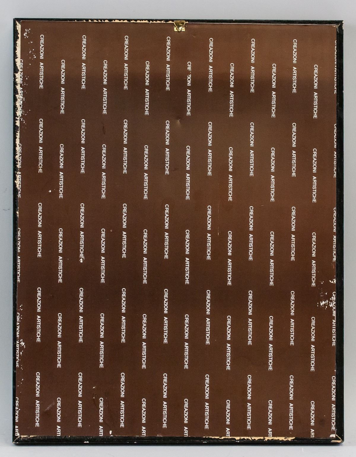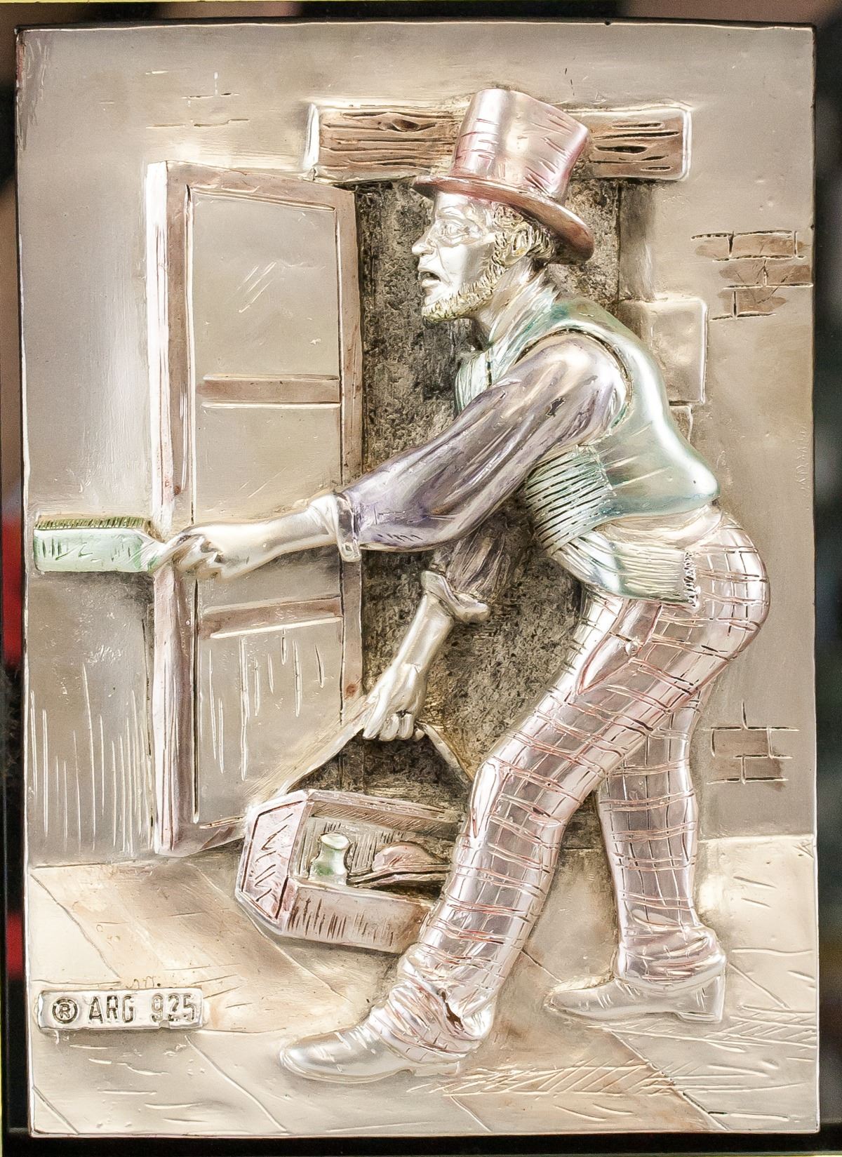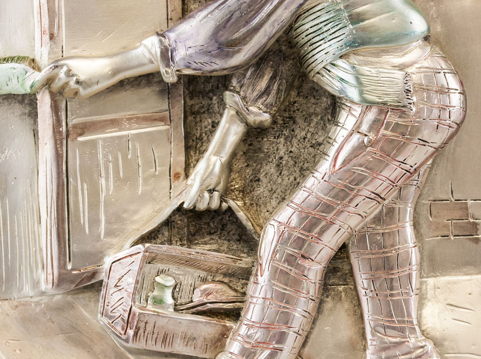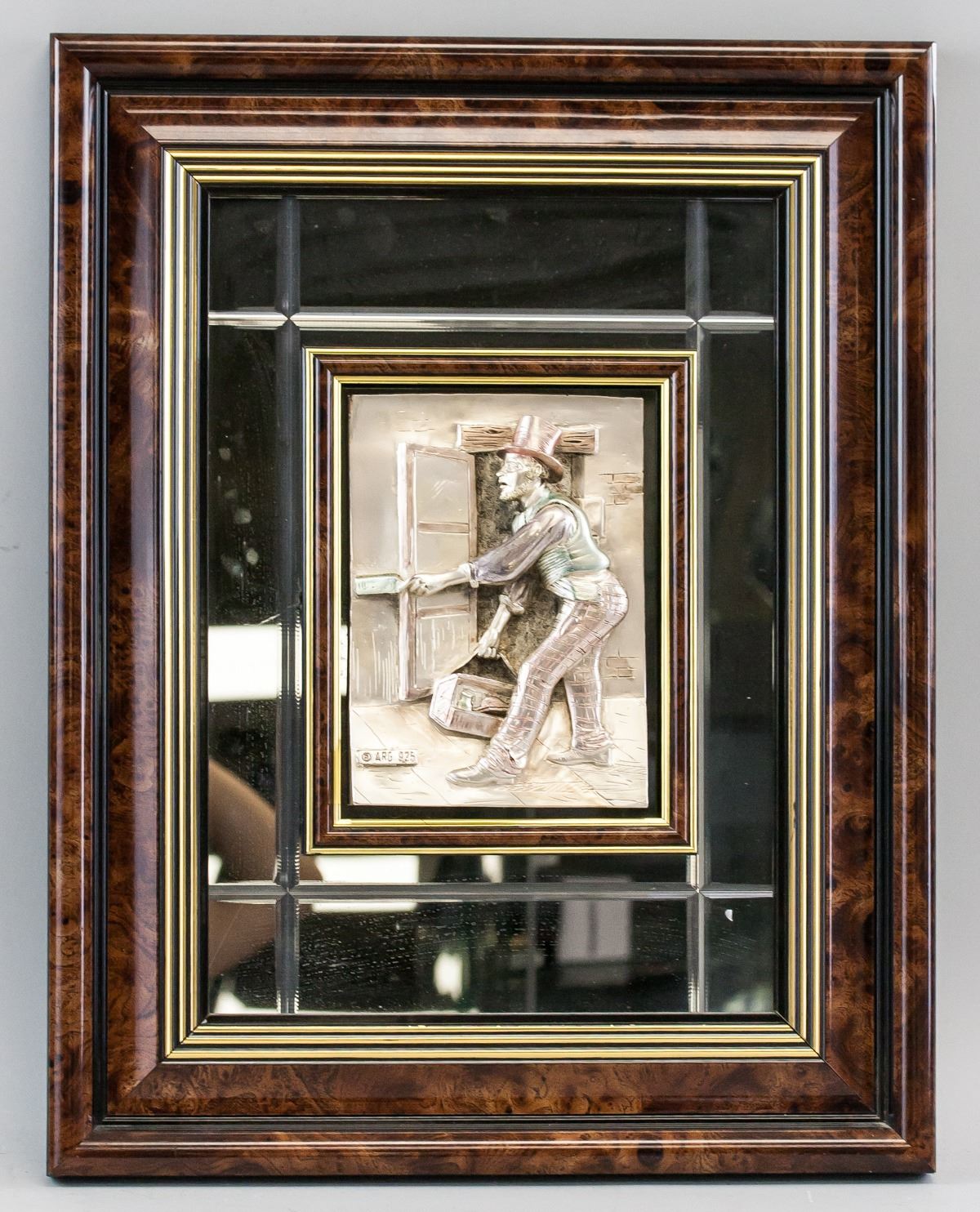 Carving in silver, framed with mirror. Featuring a man holding a brush. Stamped "ARG 925" in the bottom left corner. 18 x 13 cm (7 x 5 inches) Frame: 50 x 40 cm (19.5 x 15.5 inches), 2608 grams