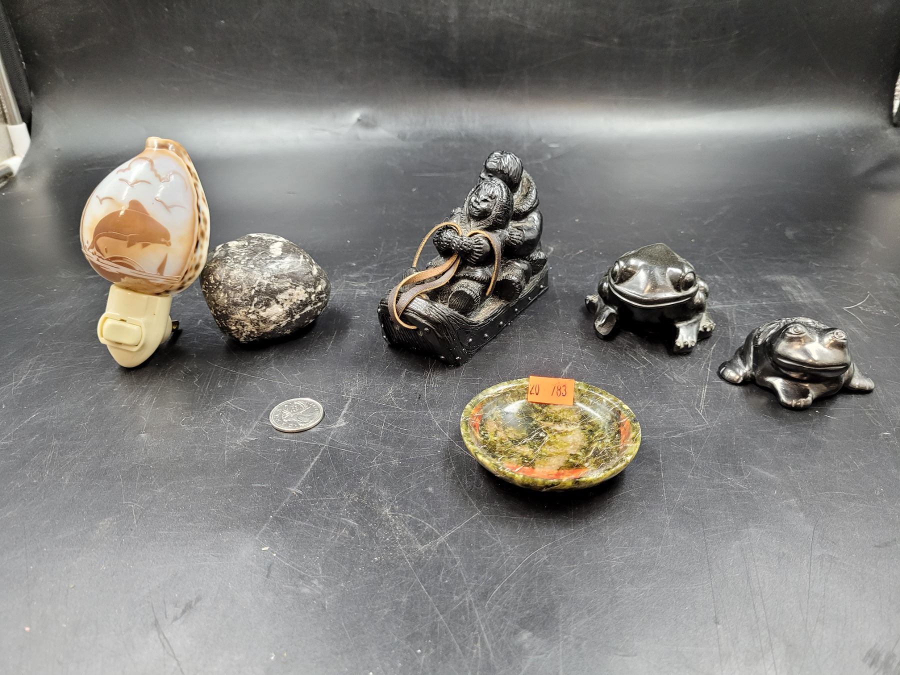 Carved Figures, Stone Bowl, & Shell Nightlight