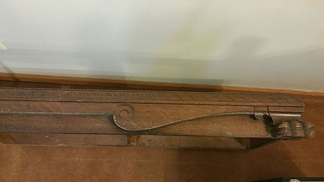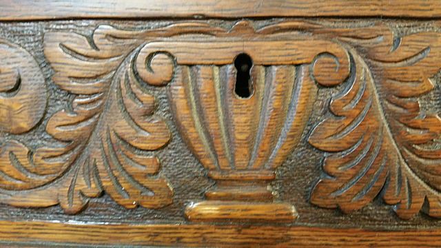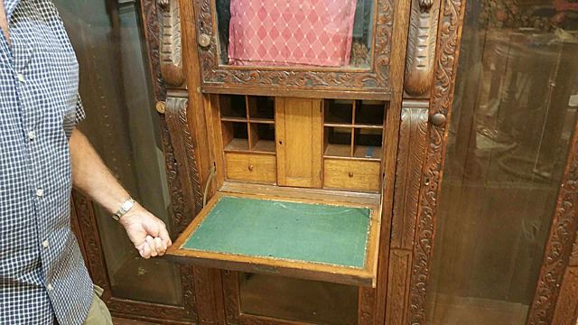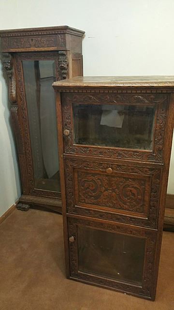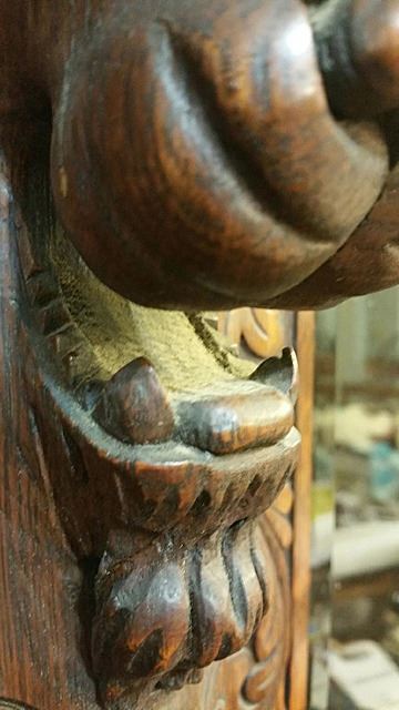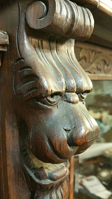 Triple carved gargoyle oak bookcase/ desk combination, which we attribute to RJ Horner and Sons out of New York, with full carved griffins, huge claw feet at the base, bevelled glass doors, flanked by open mouthed griffin on either side. Opens up on left and right hand side to adjustable shelves for display, flanked in center by drop lidded secretary desk, which also has the beveled glass curio. Original label "Lincoln Safe Deposit Co., New York", where stored by family at one time. All over floral carvings throughout. Beautiful triple carved bookcase! This bookcase measures 6 ft. wide x 67" high x 19" deep.