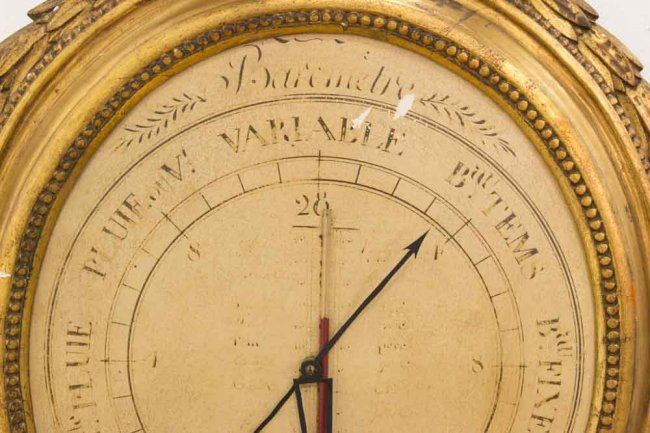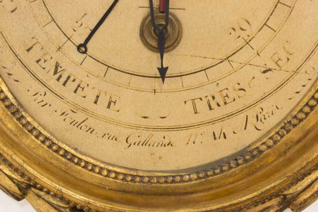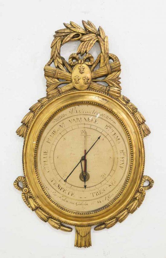 Decorative quality. Approx. 32" H x 20" W. Needle bent. Wear on face. Nicks on frame.