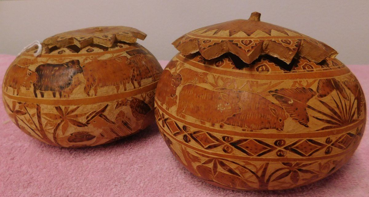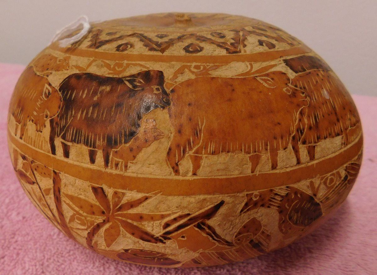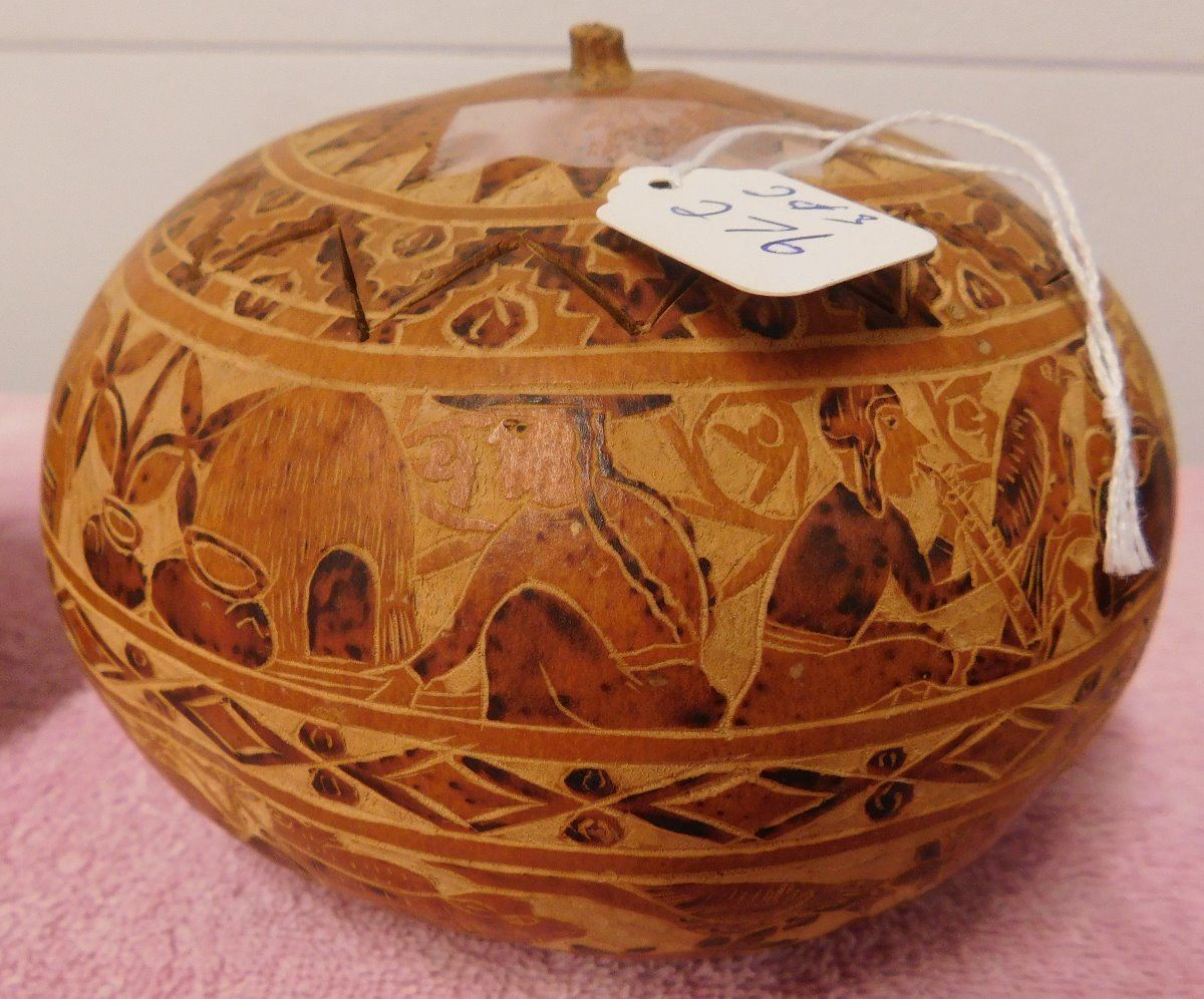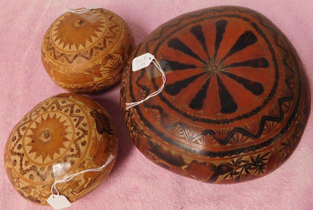 Carved Gourd Collection, circa 1930s. Made of gourds, the items measure 6" x 6" x 3" to 9.5" x 9" x 3.5". Peru. Very fine carving on gourds, largest is a rattle. Condition: Good, see images. Shipping: $30.00 w/insurance and signature.