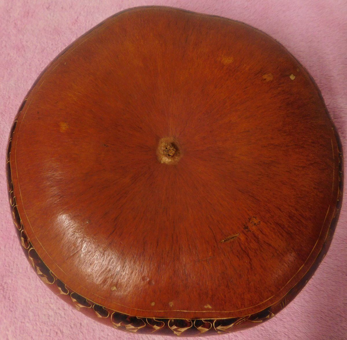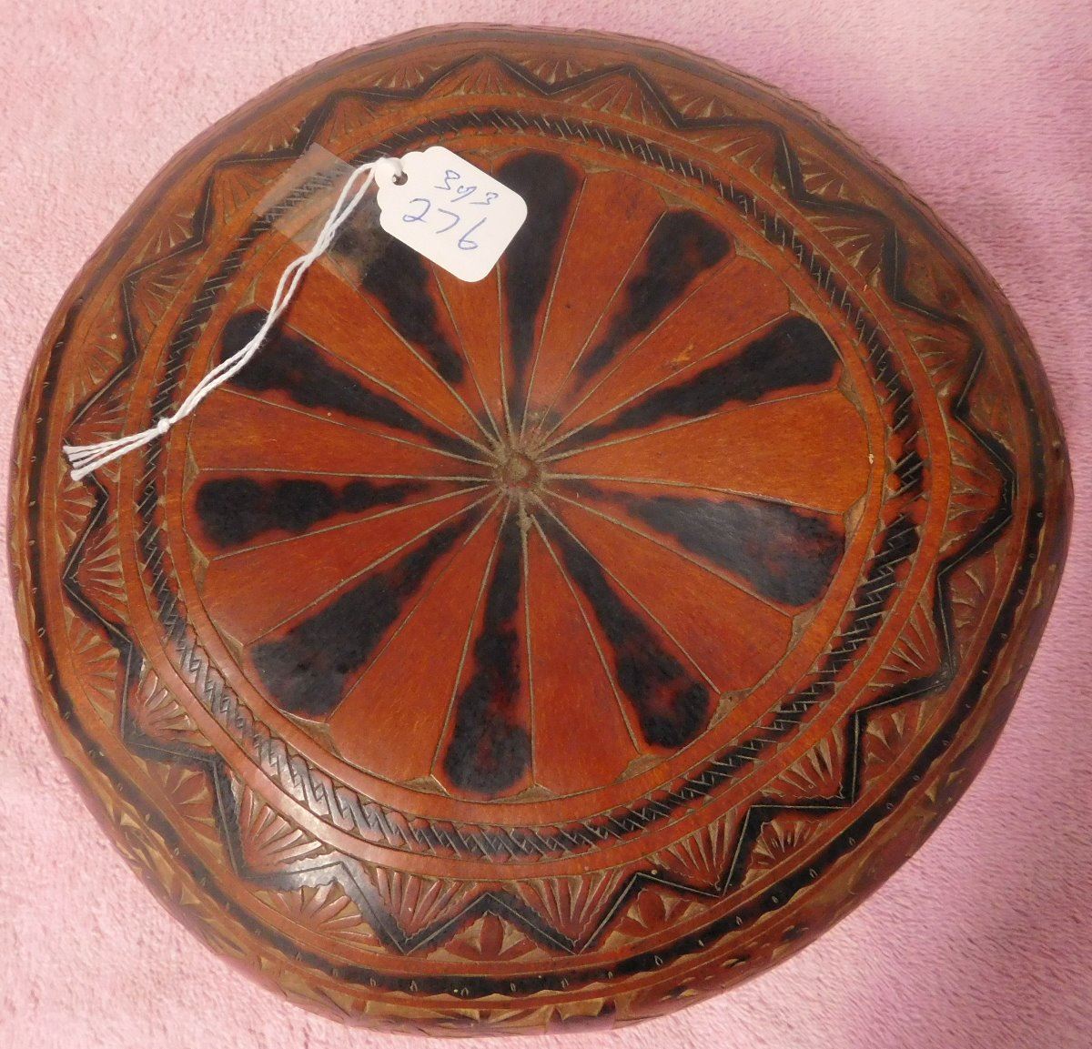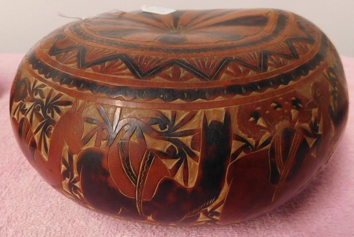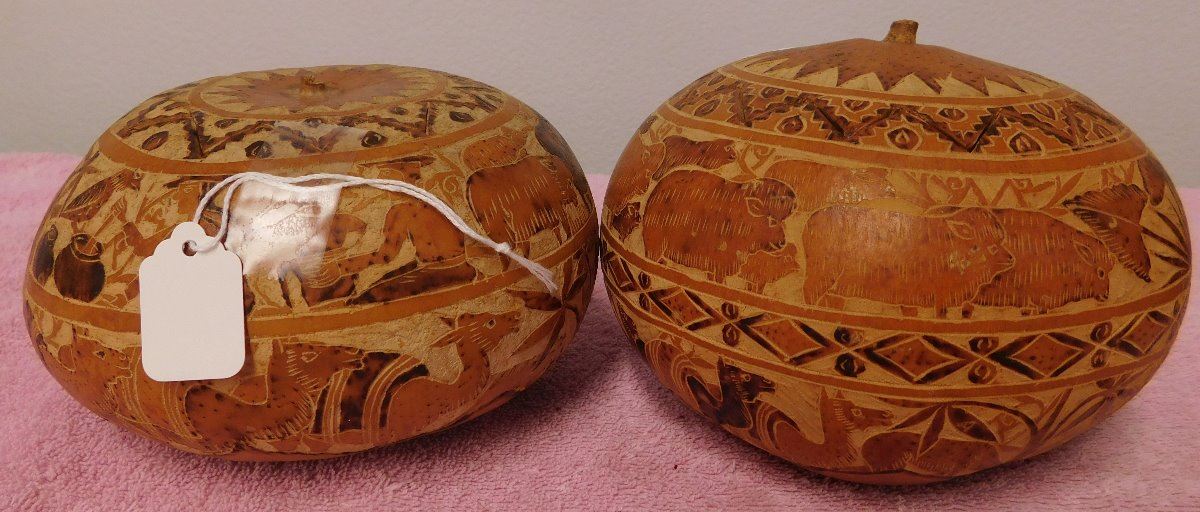 Carved Gourd Collection, circa 1930s. Made of gourds, the items measure 6" x 6" x 3" to 9.5" x 9" x 3.5". Peru. Very fine carving on gourds, largest is a rattle. Condition: Good, see images. Shipping: $30.00 w/insurance and signature.