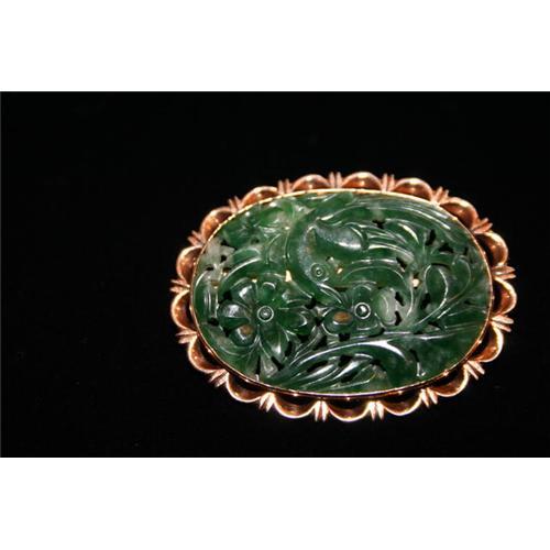 <table width="100%" border="0" cellspacing="0" cellpadding="4"><tr><td><em> Rich and elegant! A turly beautiful, classic brooch- a wonderful gift!</em></td></tr><tr> <td width="100%"> Beautiful, intricately carved jade brooch set in 14K yellow gold. A very wearable and collectible piece. </td></tr><tr> <td> </td></tr><tr> <td>Reference #: P81</td></tr><tr><td>Condition:Excellent</td></tr><tr><td>Year:1930-1950</td></tr><tr><td>Height:1.4</td></tr><tr><td>Width:1.8</td></tr><tr><td>Title:Carved Green Jade Brooch/Pin in 14K Yellow Gold</td></tr><tr><td>Materials:14K Gold, Jade</td></tr><tr><td>Location:Minneapolis, Minnesota</td></tr></table>