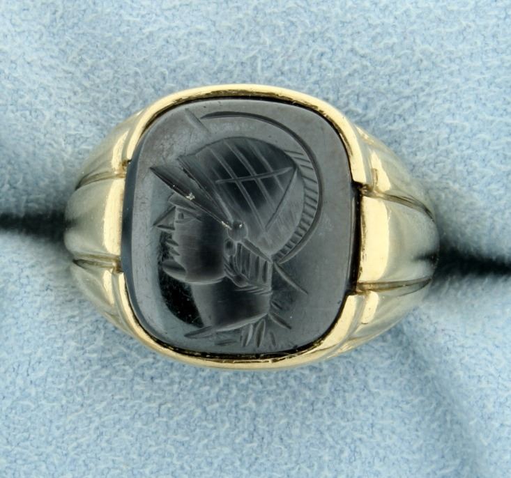 In 10K yellow gold. The signet is 15x14mm, and the ring is a size 11 1/2 7.4g