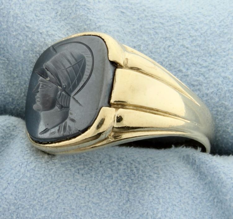 In 10K yellow gold. The signet is 15x14mm, and the ring is a size 11 1/2 7.4g