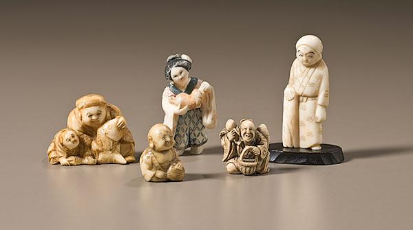 early 20th century, a group of five netsukes, various forms including geisha with puppy and lohan, with stained details, some are signed; .875" to 2" high.