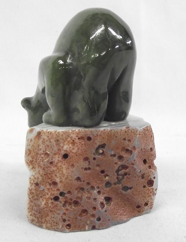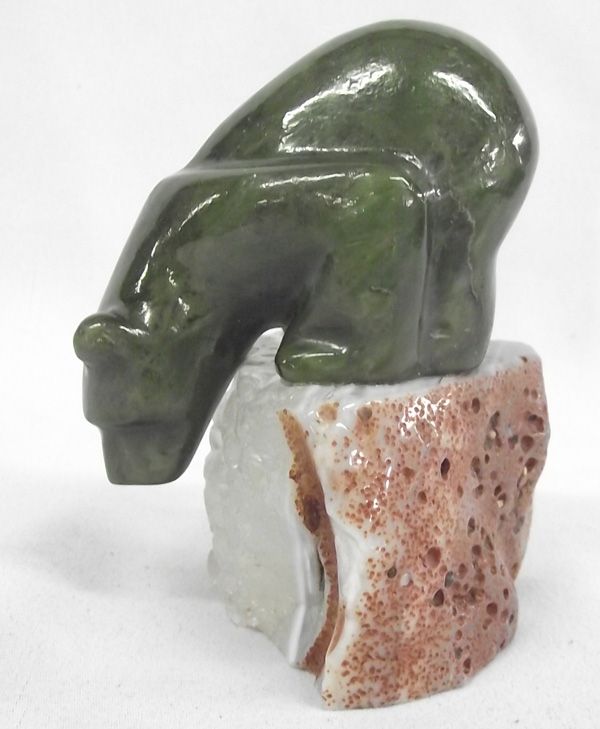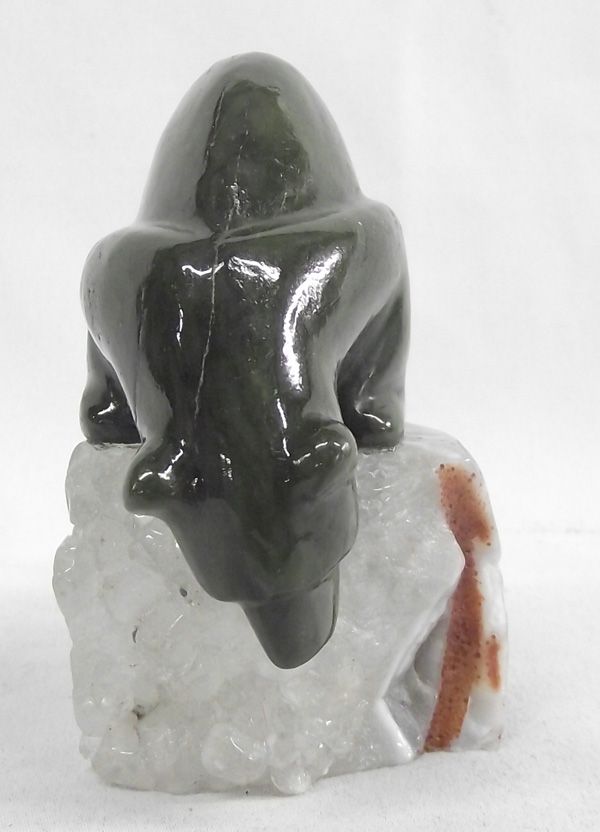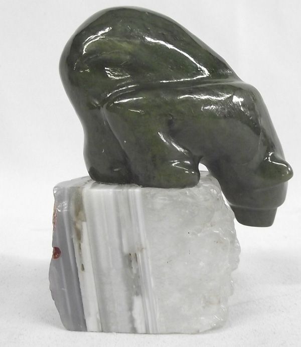 Carved Jade Bear on Quartz Crystal Base, dark green jade bear sitting atop quartz base looking down, gorgeous colors, measures approx. 3.25''H x 2.25''W