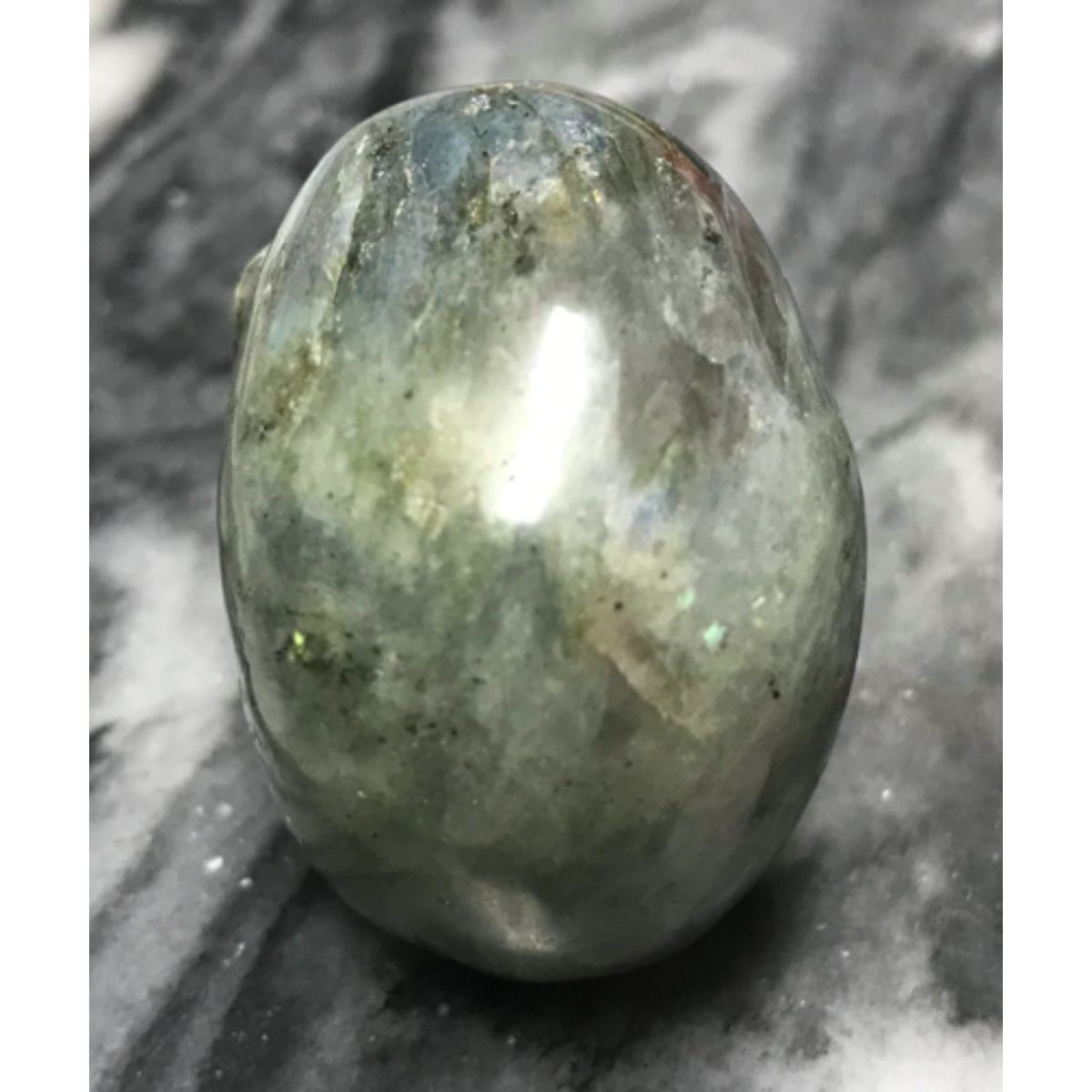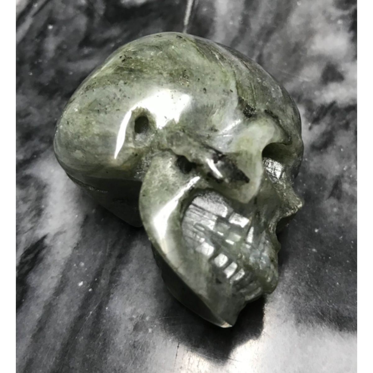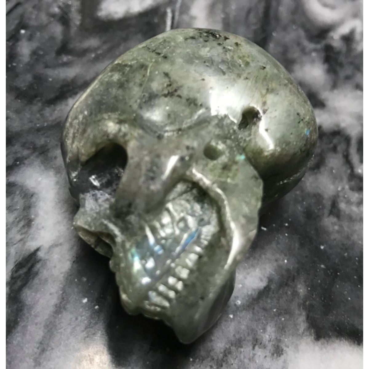 Carved labradorite gemstone in the form of a skeleton skull. 2.0"x1.5"x1.1"( 50x37x29mm ). Weight: 2.7 oz ( 76g ).
