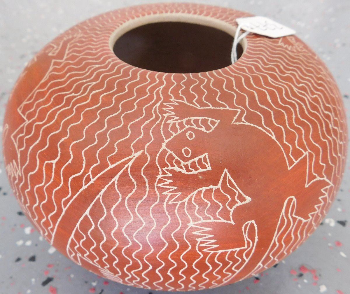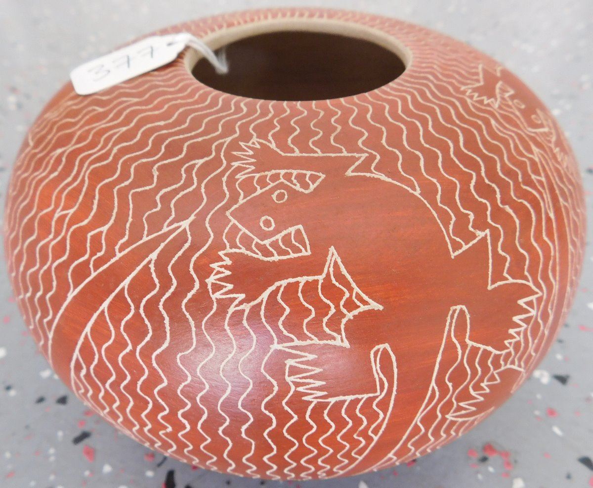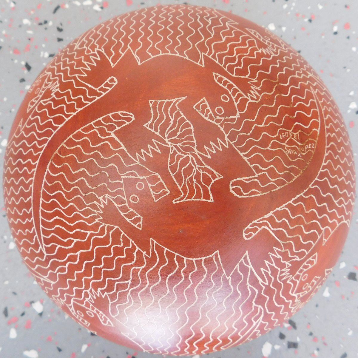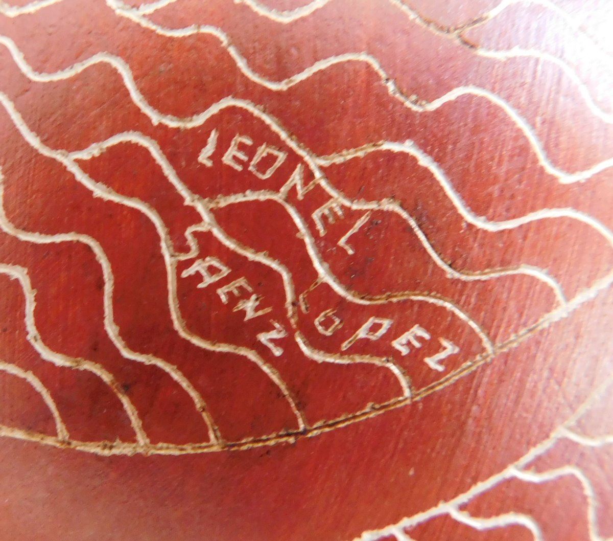 Carved Lizard Effigy Olla, circa 1970s. Made of clay and paint, this item measures 6" x 6" x 4". Signed Leonel Lopez Saenz. Mata Ortiz. About 10 lizard effigies hand-carved in this busy, eye-catching design. Condition: Very good, see images. Shipping: $22.50 w/insurance and signature.