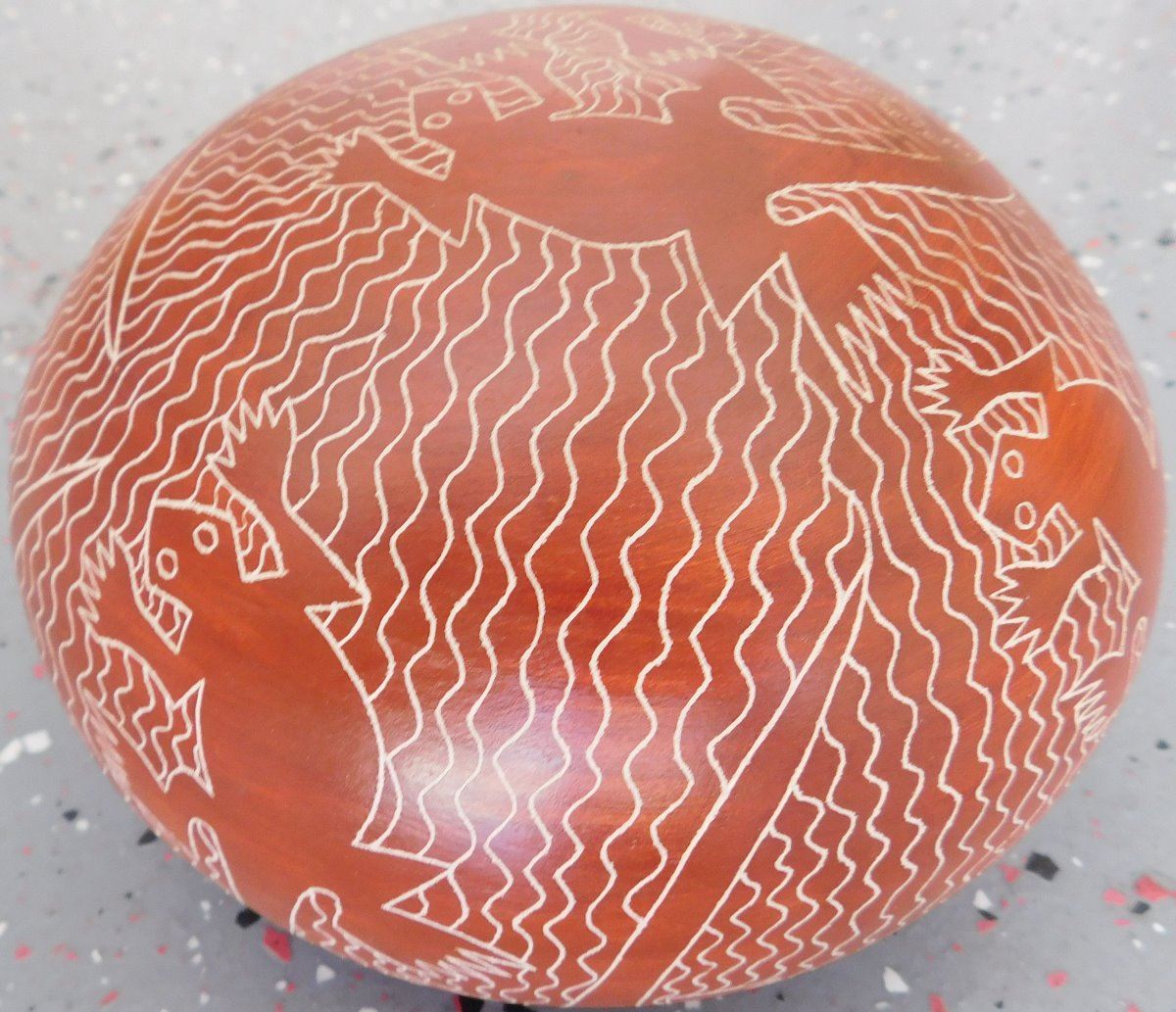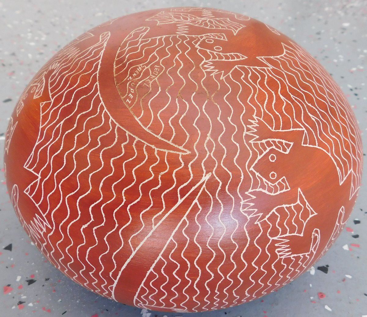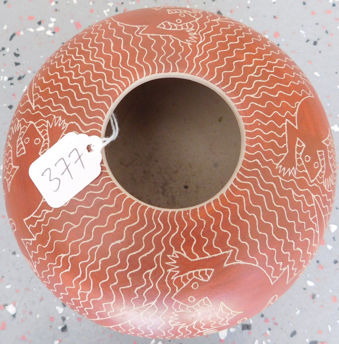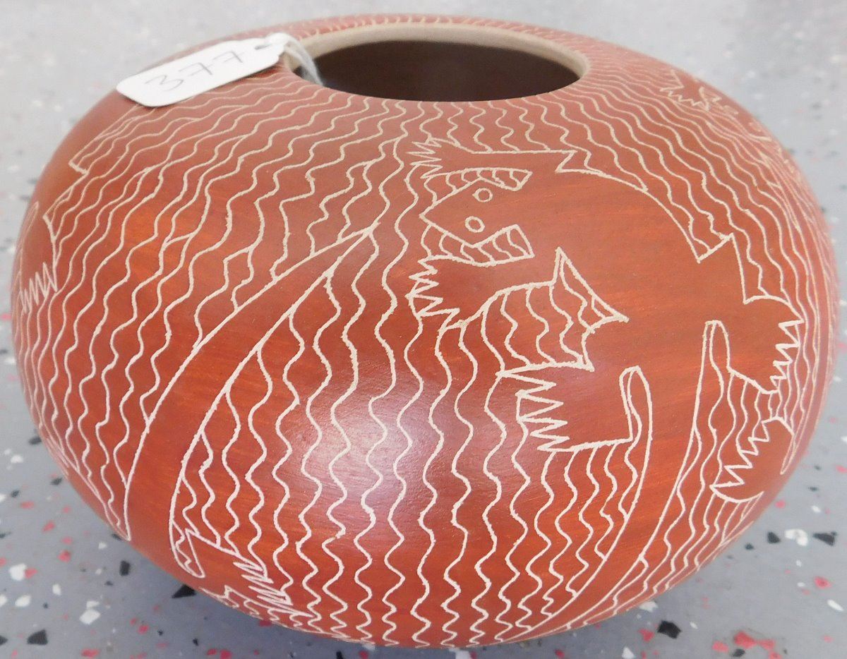 Carved Lizard Effigy Olla, circa 1970s. Made of clay and paint, this item measures 6" x 6" x 4". Signed Leonel Lopez Saenz. Mata Ortiz. About 10 lizard effigies hand-carved in this busy, eye-catching design. Condition: Very good, see images. Shipping: $22.50 w/insurance and signature.