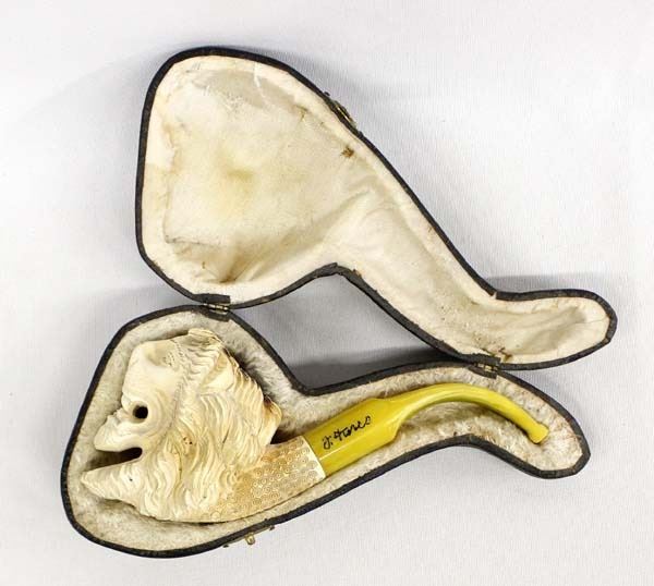 Carved Meerchaum Lion Head Pipe and Case, 1.5'' X 2.5'' X 6''