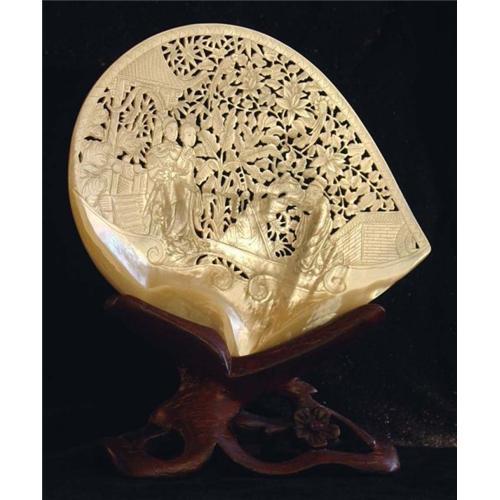 Extraordinary carved mother-of-pearl shell on custom made carved wood stand. The mother of pearl is intricately carved with a motif of a courting couple and an older man hiding behind a tree with a background of leaves, flowers and birds. In very good condition as shown. Please ask questions, request additional photos and shipping costs before buying.