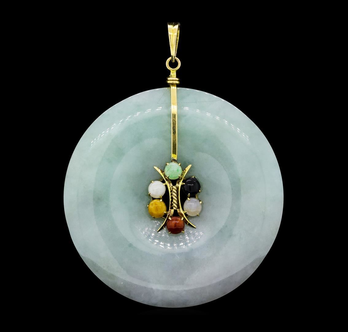 One pendant featuring: 14KT yellow gold weighing 36.4 grams containing multi-colored jades set on circular piece of nephrite jade measure approximately two inches in diameter.
