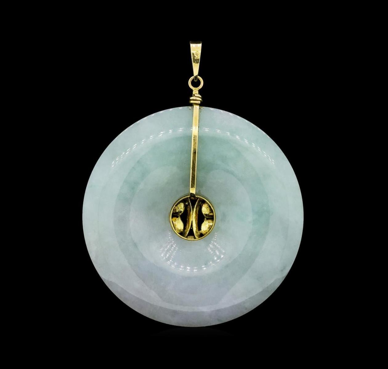 One pendant featuring: 14KT yellow gold weighing 36.4 grams containing multi-colored jades set on circular piece of nephrite jade measure approximately two inches in diameter.