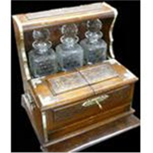 Handsome oaken box with liquor bottles. Marked by Rudolfo Eister. Small break in wood.