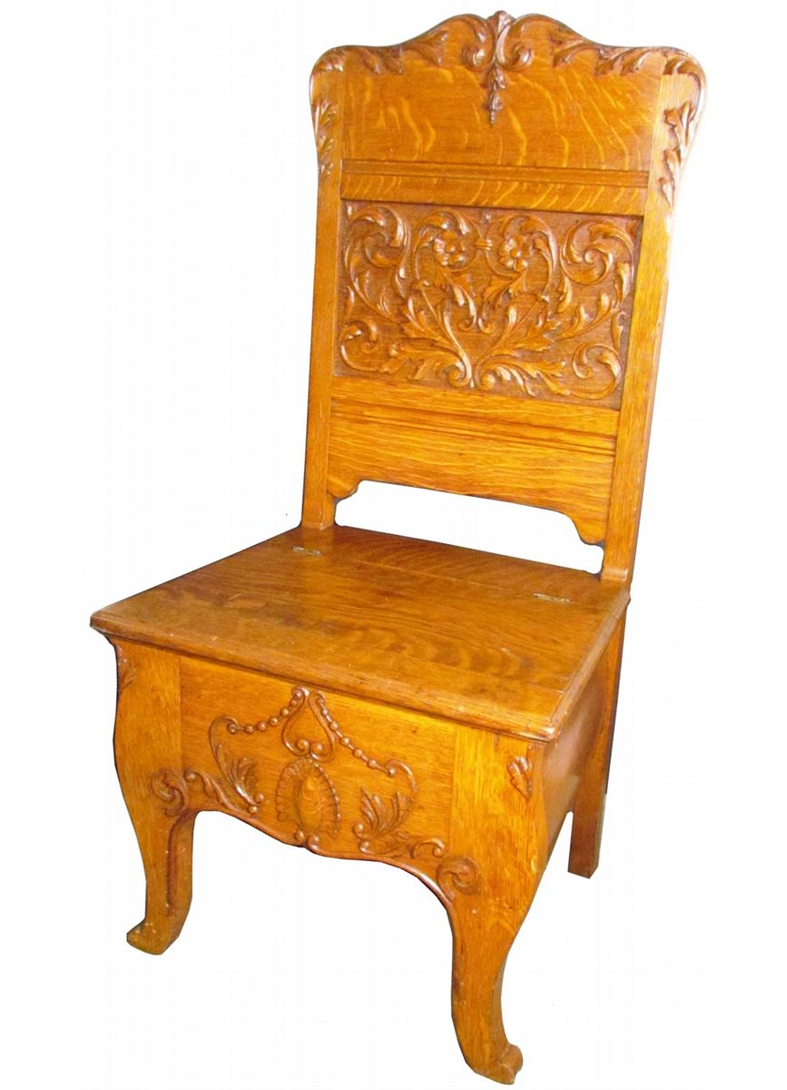 Carved Oak Chair with Storage Seat. Carved floral motif. Excellent original condition. 44 X 22 X 18 inches.