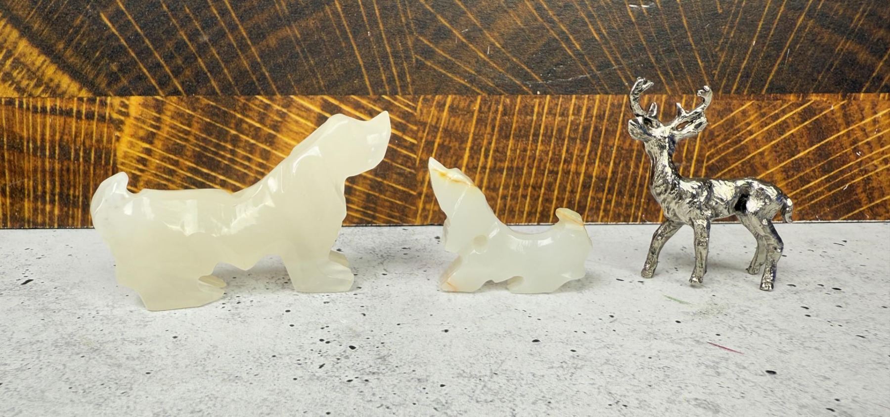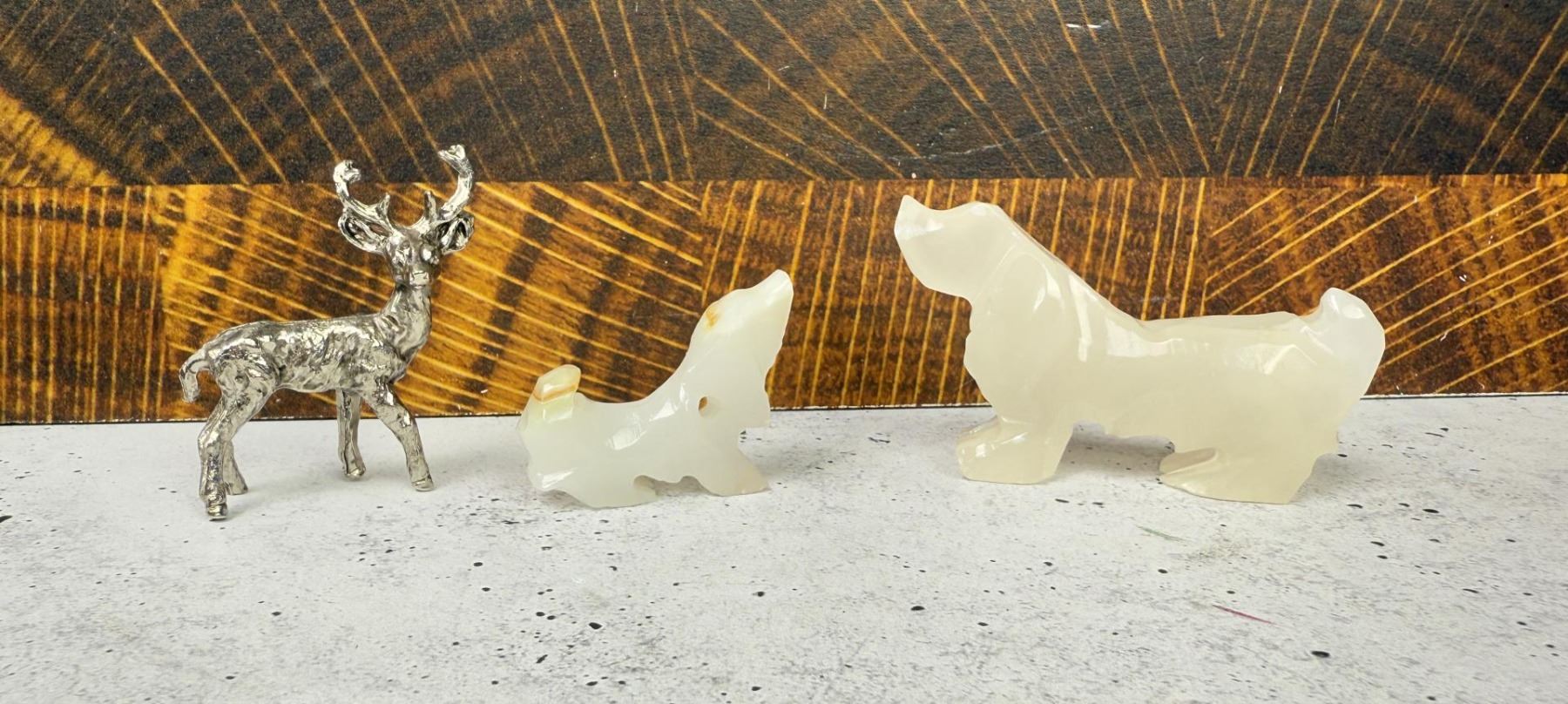 Two carved onyx dogs, largest is 2 1/4" by 1" wide. Cast metal deer. 2" long.